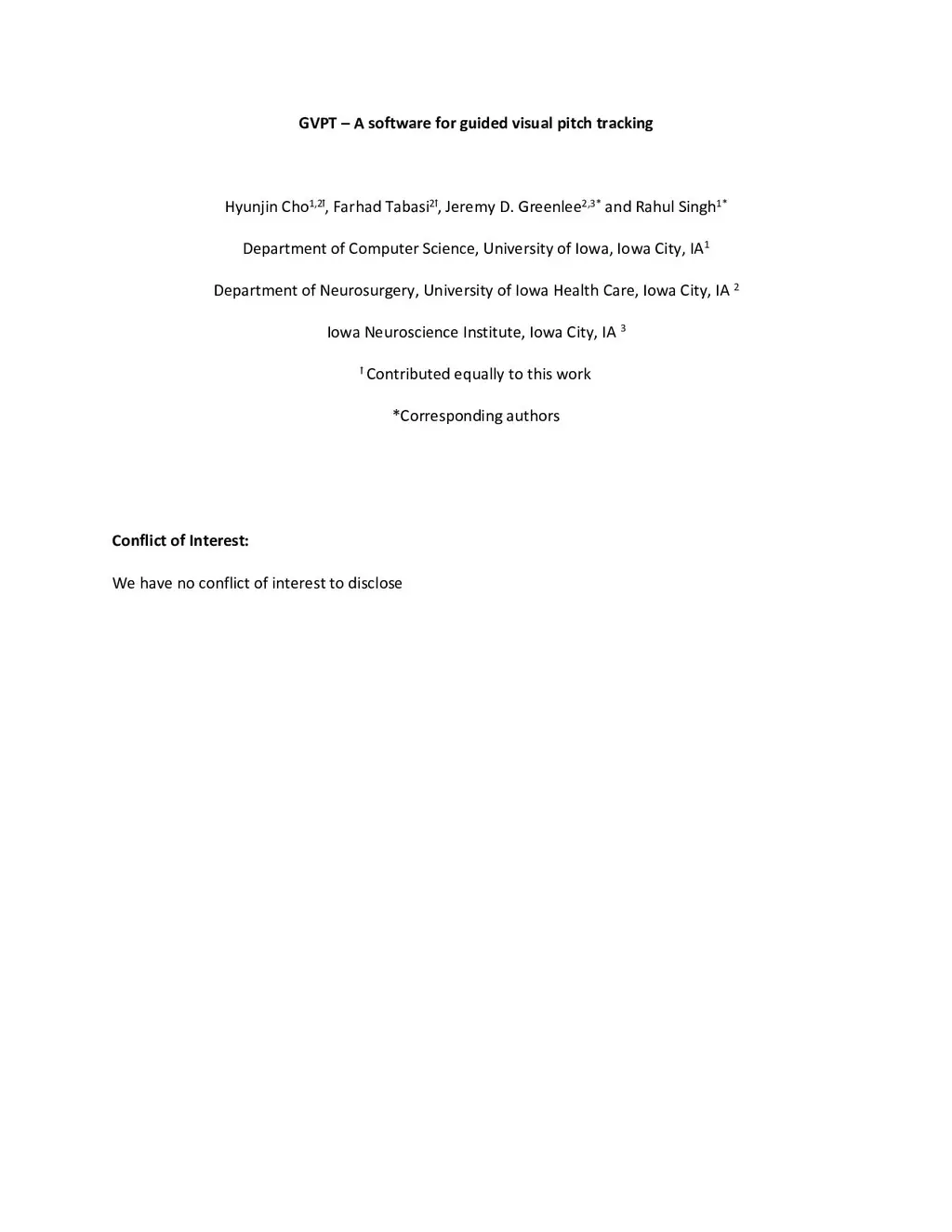 GVPT (Guided visual pitch tracking) is a publicly available, real-time pitch tracking software designed to guide and evaluate vocal pitch control using visual feedback. Developed for clinical and research applications, the system presents various visual target pitch contour and overlays the subject's pitch in real-time to promote accurate vocal reproduction. GVPT supports difficulty modification, session logging, and precise pitch tracking. The software enables voice pitch control exercise in both experimental and therapeutic settings.