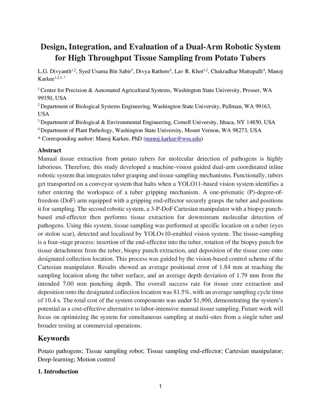 Design, Integration, and Evaluation of a Dual-Arm Robotic System for High Throughput Tissue Sampling from Potato Tubers