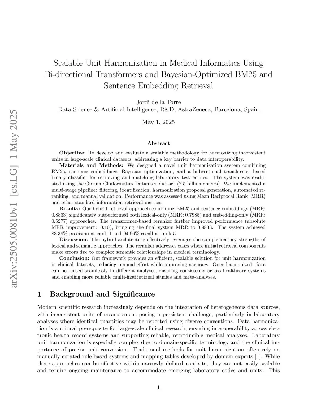 Scalable Unit Harmonization in Medical Informatics via Bayesian-Optimized Retrieval and Transformer-Based Re-ranking