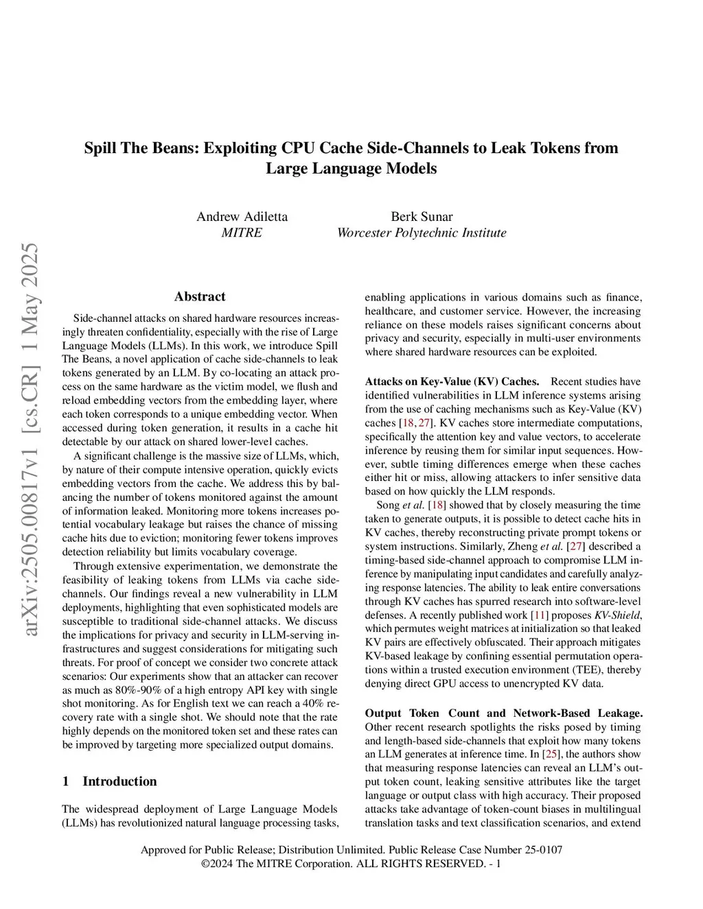 Side-channel attacks on shared hardware resources increasingly threaten confidentiality, especially with the rise of Large Language Models (LLMs). In this work, we introduce Spill The Beans, a novel application of cache side-channels to leak tokens generated by an LLM. By co-locating an attack process on the same hardware as the victim model, we flush and reload embedding vectors from the embedding layer, where each token corresponds to a unique embedding vector. When accessed during token generation, it results in a cache hit detectable by our attack on shared lower-level caches.A significant challenge is the massive size of LLMs, which, by nature of their compute intensive operation, quickly evicts embedding vectors from the cache. We address this by balancing the number of tokens monitored against the amount of information leaked. Monitoring more tokens increases potential vocabulary leakage but raises the chance of missing cache hits due to eviction; monitoring fewer tokens improves detection reliability but limits vocabulary coverage.Through extensive experimentation, we demonstrate the feasibility of leaking tokens from LLMs via cache side-channels. Our findings reveal a new vulnerability in LLM deployments, highlighting that even sophisticated models are susceptible to traditional side-channel attacks. We discuss the implications for privacy and security in LLM-serving infrastructures and suggest considerations for mitigating such threats. For proof of concept we consider two concrete attack scenarios: Our experiments show that an attacker can recover as much as 80%-90% of a high entropy API key with single shot monitoring. As for English text we can reach a 40% recovery rate with a single shot. We should note that the rate highly depends on the monitored token set and these rates can be improved by targeting more specialized output domains.