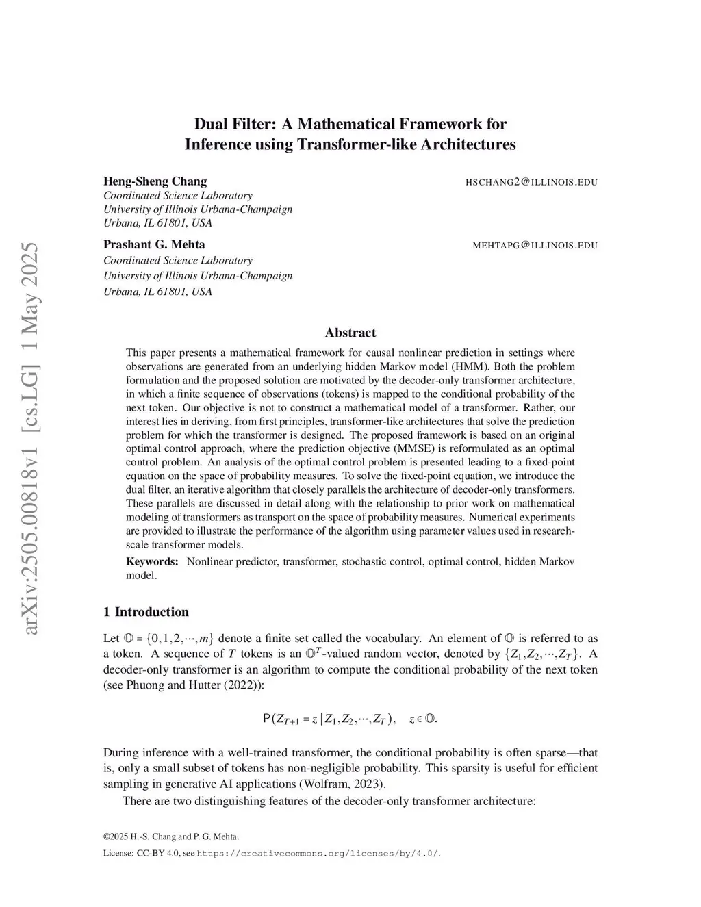 This paper presents a mathematical framework for causal nonlinear prediction in settings where observations are generated from an underlying hidden Markov model (HMM). Both the problem formulation and the proposed solution are motivated by the decoder-only transformer architecture, in which a finite sequence of observations (tokens) is mapped to the conditional probability of the next token. Our objective is not to construct a mathematical model of a transformer. Rather, our interest lies in deriving, from first principles, transformer-like architectures that solve the prediction problem for which the transformer is designed. The proposed framework is based on an original optimal control approach, where the prediction objective (MMSE) is reformulated as an optimal control problem. An analysis of the optimal control problem is presented leading to a fixed-point equation on the space of probability measures. To solve the fixed-point equation, we introduce the dual filter, an iterative algorithm that closely parallels the architecture of decoder-only transformers. These parallels are discussed in detail along with the relationship to prior work on mathematical modeling of transformers as transport on the space of probability measures. Numerical experiments are provided to illustrate the performance of the algorithm using parameter values used in researchscale transformer models.