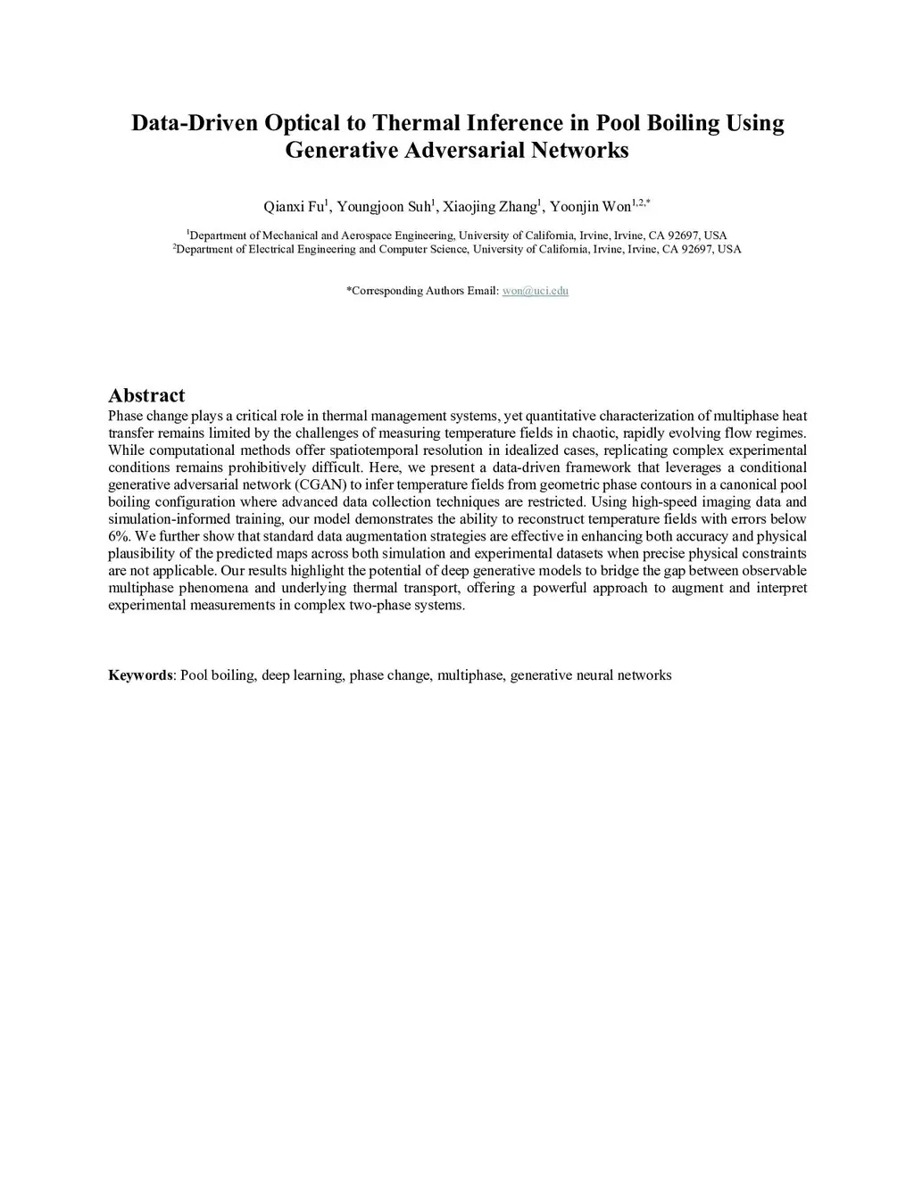 Phase change process plays a critical role in thermal management systems, yet quantitative characterization of multiphase heat transfer remains limited by the challenges of measuring temperature fields in chaotic, rapidly evolving flow regimes. While computational methods offer temperature data at a high spatiotemporal resolution in ideal cases, replicating complex experimental conditions remains prohibitively difficult. In this paper, we present a deep learning framework that can generate temperature field data at simulation resolution from segmented high-speed recordings and pointwise thermocouple readings which are typically available in a canonical pool boiling experimental configuration without requiring advanced techniques. This framework leverages a conditional generative adversarial network trained only on simulation data. To ensure direct applicability of the model to experimental data, our framework also introduces a preprocessing pipeline that aligns high resolution simulation data with experimental measurements through both conventional image processing and image segmentation with pretrained convolutional neural network. We further show that standard data augmentation strategies are effective in enhancing the physical plausibility of the inference when precise physical constraints are not applicable. Our results highlight the potential of deep generative models to bridge the gap between observable multiphase phenomena and underlying thermal transport, offering a powerful approach to augment and interpret experimental measurements in complex two-phase systems.