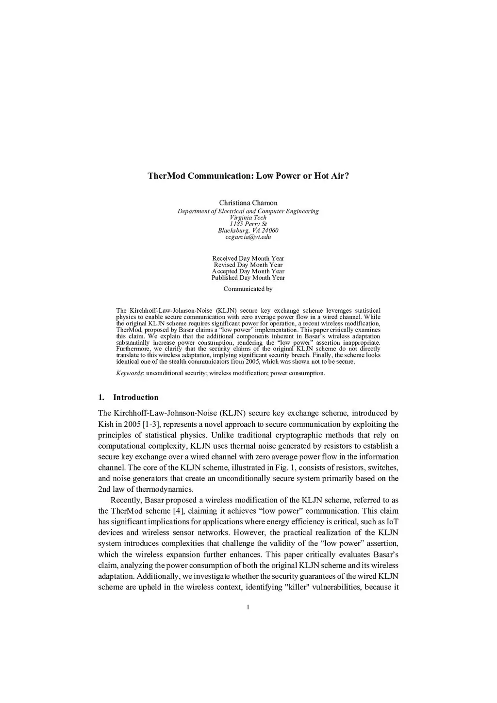 The Kirchhoff-Law-Johnson-Noise (KLJN) secure key exchange scheme leverages statistical physics to enable secure communication with zero average power flow in a wired channel. While the original KLJN scheme requires significant power for operation, a recent wireless modification, TherMod, proposed by Basar claims a "low power" implementation. This paper critically examines this claim. We explain that the additional components inherent in Basar's wireless adaptation substantially increase power consumption, rendering the "low power" assertion inappropriate. Furthermore, we clarify that the security claims of the original KLJN scheme do not directly translate to this wireless adaptation, implying significant security breach. Finally, the scheme looks identical one of the stealth communicators from 2005, which was shown not to be secure.