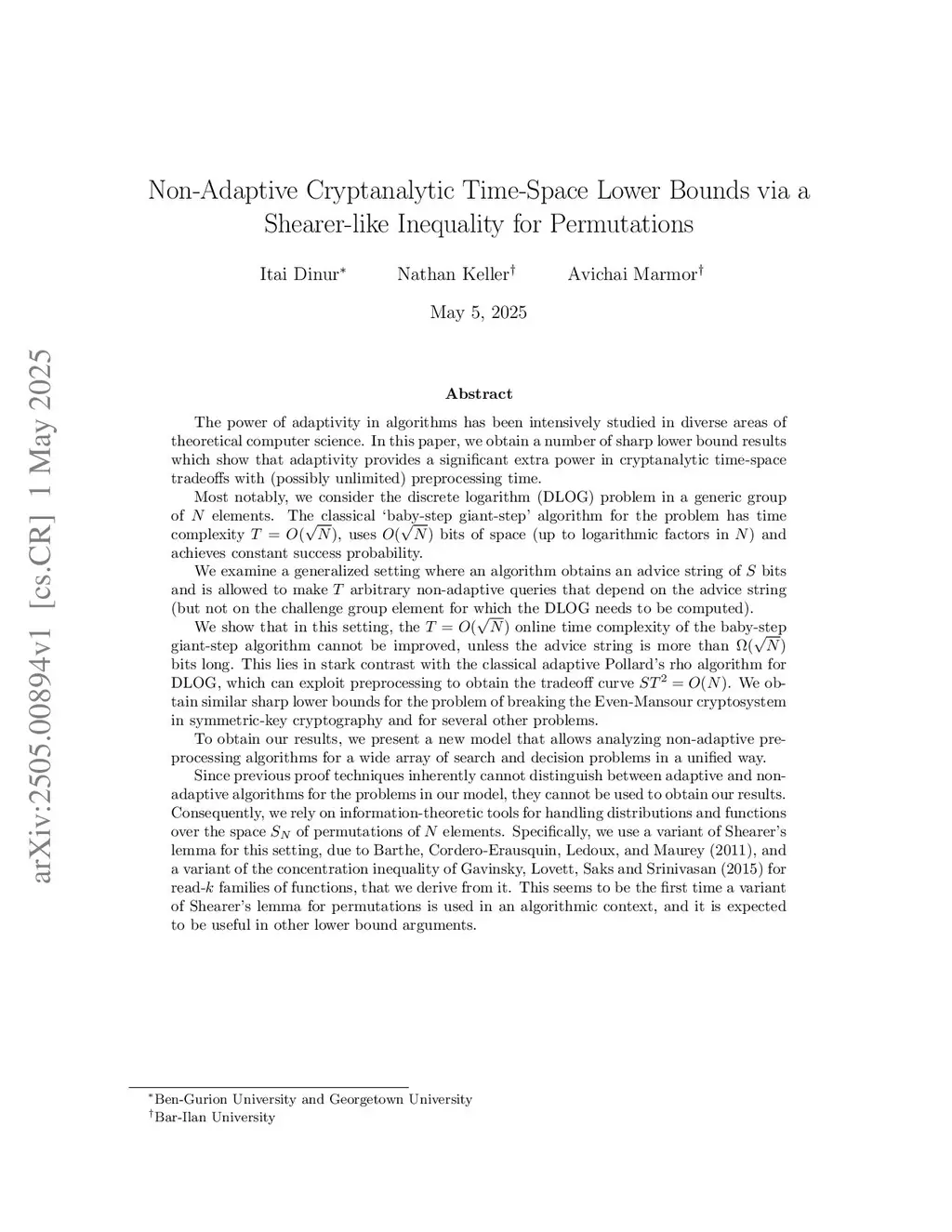 The power of adaptivity in algorithms has been intensively studied in diverse areas of theoretical computer science. In this paper, we obtain a number of sharp lower bound results which show that adaptivity provides a significant extra power in cryptanalytic time-space tradeoffs with (possibly unlimited) preprocessing time.Most notably, we consider the discrete logarithm (DLOG) problem in a generic group of elements. The classical `baby-step giant-step' algorithm for the problem has time complexity , uses bits of space (up to logarithmic factors in ) and achieves constant success probability.We examine a generalized setting where an algorithm obtains an advice string of bits and is allowed to make arbitrary non-adaptive queries that depend on the advice string (but not on the challenge group element).We show that in this setting, the online time complexity of the baby-step giant-step algorithm cannot be improved, unless the advice string is more than bits long. This lies in stark contrast with the classical adaptive Pollard's rho algorithm for DLOG, which can exploit preprocessing to obtain the tradeoff curve . We obtain similar sharp lower bounds for several other cryptanalytic problems.To obtain our results, we present a new model that allows analyzing non-adaptive preprocessing algorithms for a wide array of search and decision problems in a unified way. Since previous proof techniques inherently cannot distinguish between adaptive and non-adaptive algorithms for the problems in our model, they cannot be used to obtain our results. Consequently, our proof uses a variant of Shearer's lemma for this setting, due to Barthe, Cordero-Erausquin, Ledoux, and Maurey (2011). This seems to be the first time a variant of Shearer's lemma for permutations is used in an algorithmic context.