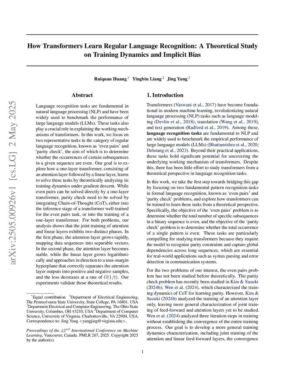 Language recognition tasks are fundamental in natural language processing (NLP) and have been widely used to benchmark the performance of large language models (LLMs). These tasks also play a crucial role in explaining the working mechanisms of transformers. In this work, we focus on two representative tasks in the category of regular language recognition, known as `even pairs' and `parity check', the aim of which is to determine whether the occurrences of certain subsequences in a given sequence are even. Our goal is to explore how a one-layer transformer, consisting of an attention layer followed by a linear layer, learns to solve these tasks by theoretically analyzing its training dynamics under gradient descent. While even pairs can be solved directly by a one-layer transformer, parity check need to be solved by integrating Chain-of-Thought (CoT), either into the inference stage of a transformer well-trained for the even pairs task, or into the training of a one-layer transformer. For both problems, our analysis shows that the joint training of attention and linear layers exhibits two distinct phases. In the first phase, the attention layer grows rapidly, mapping data sequences into separable vectors. In the second phase, the attention layer becomes stable, while the linear layer grows logarithmically and approaches in direction to a max-margin hyperplane that correctly separates the attention layer outputs into positive and negative samples, and the loss decreases at a rate of . Our experiments validate those theoretical results.