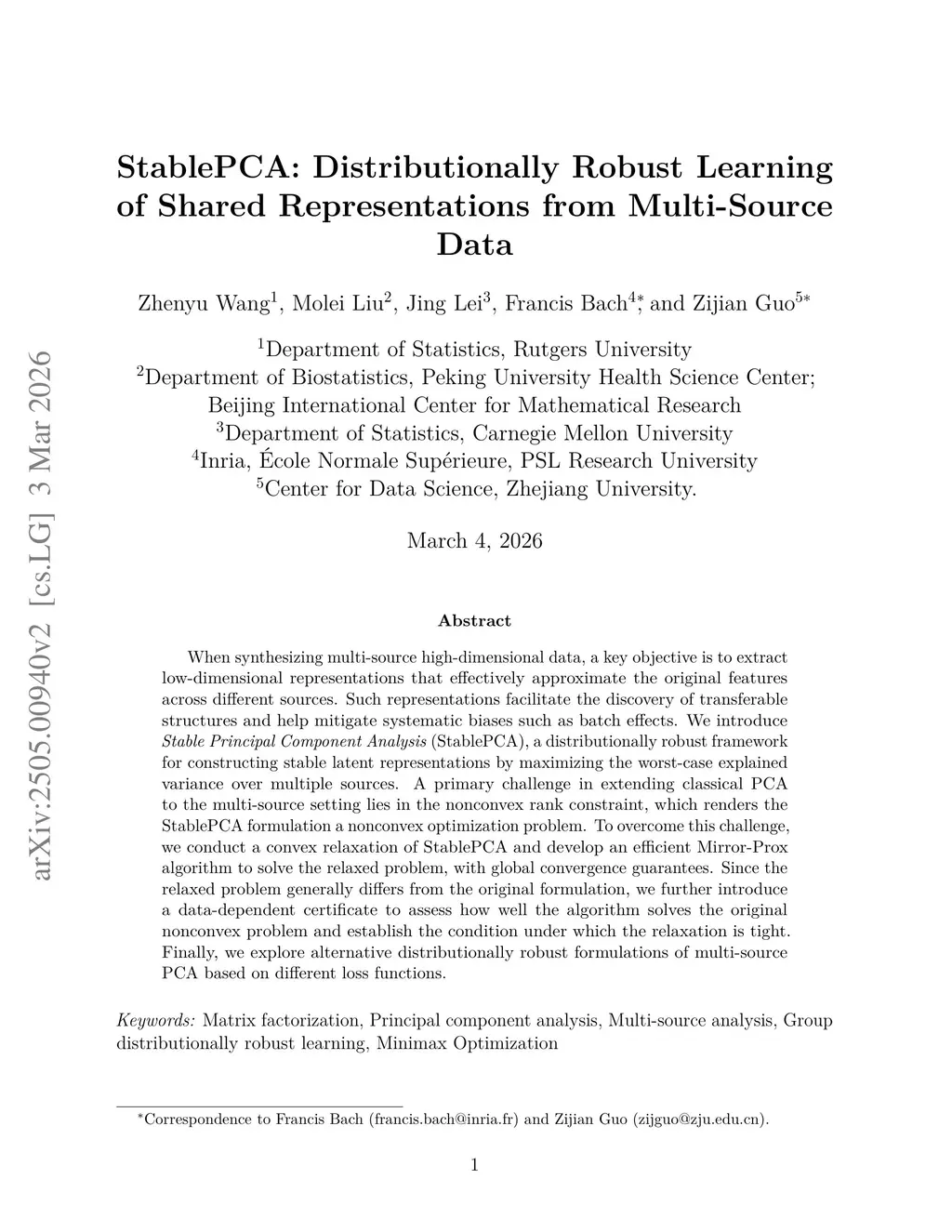 When synthesizing multi-source high-dimensional data, a key objective is to extract low-dimensional representations that effectively approximate the original features across different sources. Such representations facilitate the discovery of transferable structures and help mitigate systematic biases such as batch effects. We introduce Stable Principal Component Analysis (StablePCA), a distributionally robust framework for constructing stable latent representations by maximizing the worst-case explained variance over multiple sources. A primary challenge in extending classical PCA to the multi-source setting lies in the nonconvex rank constraint, which renders the StablePCA formulation a nonconvex optimization problem. To overcome this challenge, we conduct a convex relaxation of StablePCA and develop an efficient Mirror-Prox algorithm to solve the relaxed problem, with global convergence guarantees. Since the relaxed problem generally differs from the original formulation, we further introduce a data-dependent certificate to assess how well the algorithm solves the original nonconvex problem and establish the condition under which the relaxation is tight. Finally, we explore alternative distributionally robust formulations of multi-source PCA based on different loss functions.