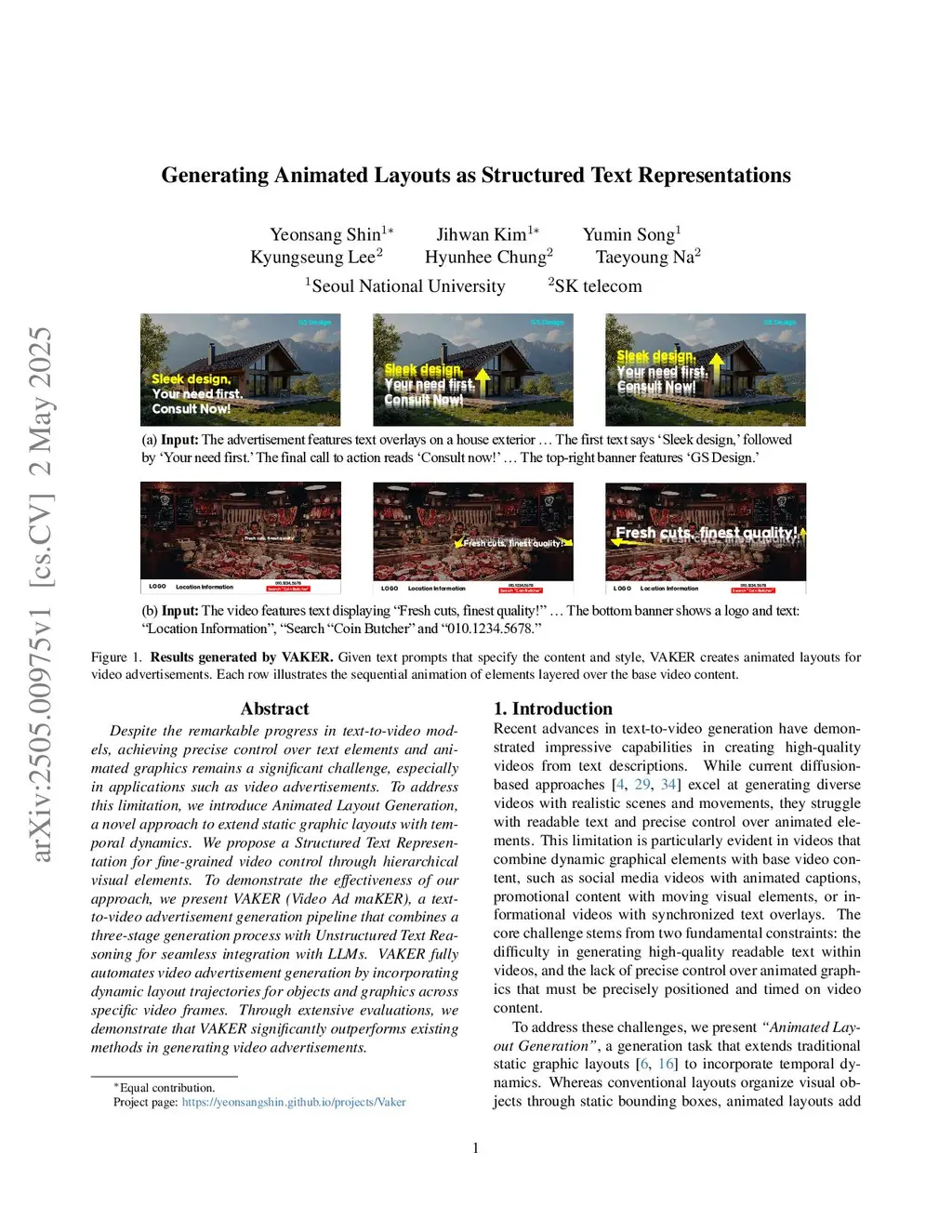 Despite the remarkable progress in text-to-video models, achieving precise control over text elements and animated graphics remains a significant challenge, especially in applications such as video advertisements. To address this limitation, we introduce Animated Layout Generation, a novel approach to extend static graphic layouts with temporal dynamics. We propose a Structured Text Representation for fine-grained video control through hierarchical visual elements. To demonstrate the effectiveness of our approach, we present VAKER (Video Ad maKER), a text-to-video advertisement generation pipeline that combines a three-stage generation process with Unstructured Text Reasoning for seamless integration with LLMs. VAKER fully automates video advertisement generation by incorporating dynamic layout trajectories for objects and graphics across specific video frames. Through extensive evaluations, we demonstrate that VAKER significantly outperforms existing methods in generating video advertisements. Project Page:this https URL