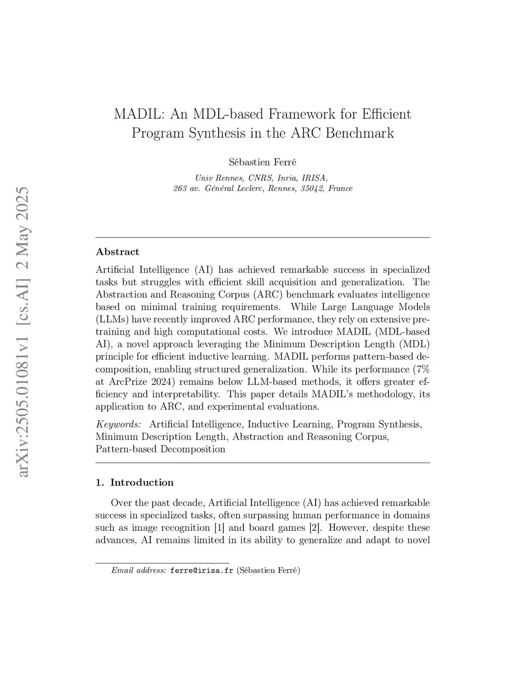 Artificial Intelligence (AI) has achieved remarkable success in specialized tasks but struggles with efficient skill acquisition and generalization. The Abstraction and Reasoning Corpus (ARC) benchmark evaluates intelligence based on minimal training requirements. While Large Language Models (LLMs) have recently improved ARC performance, they rely on extensive pre-training and high computational costs. We introduce MADIL (MDL-based AI), a novel approach leveraging the Minimum Description Length (MDL) principle for efficient inductive learning. MADIL performs pattern-based decomposition, enabling structured generalization. While its performance (7% at ArcPrize 2024) remains below LLM-based methods, it offers greater efficiency and interpretability. This paper details MADIL's methodology, its application to ARC, and experimental evaluations.