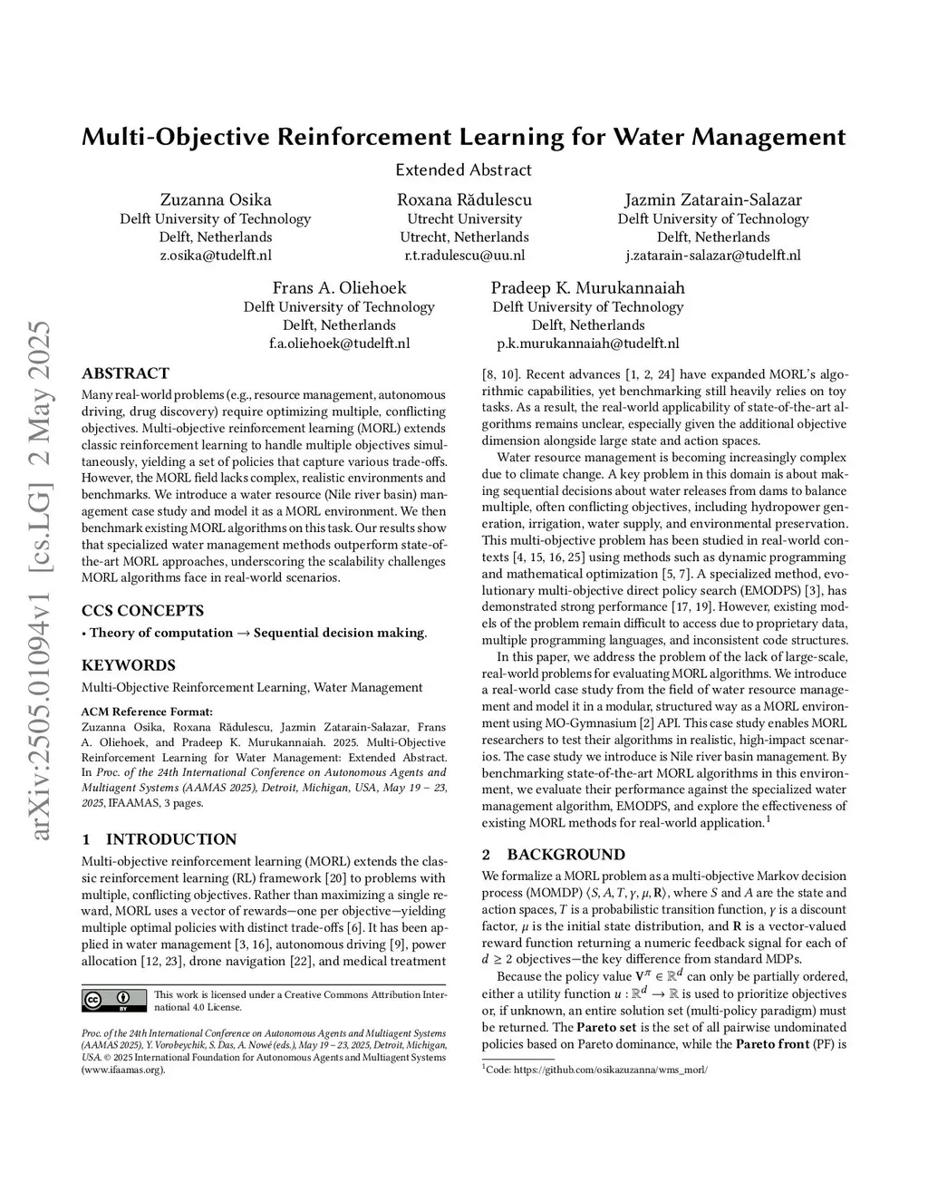 Multi-Objective Reinforcement Learning for Water Management
