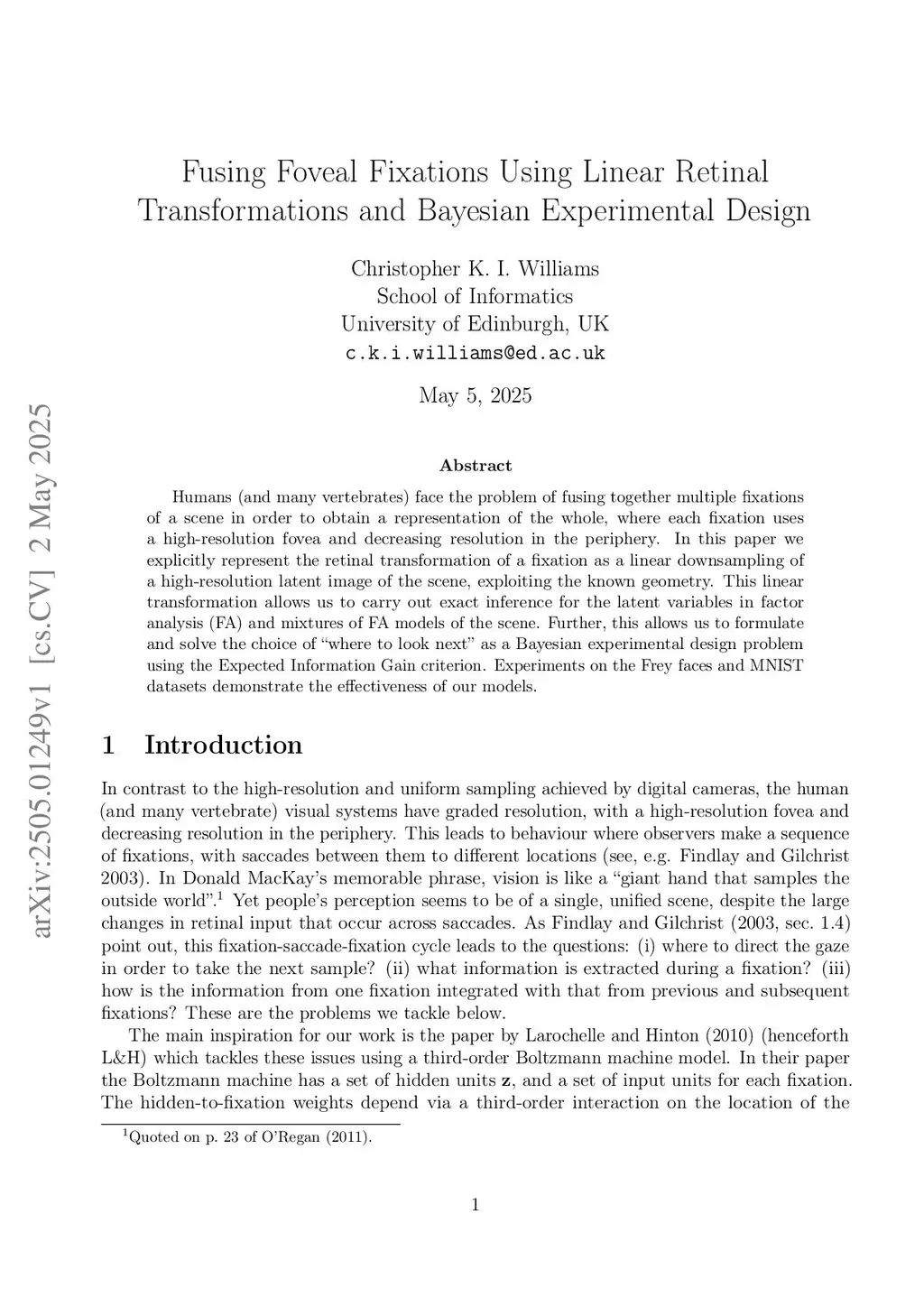 Humans (and many vertebrates) face the problem of fusing together multiple fixations of a scene in order to obtain a representation of the whole, where each fixation uses a high-resolution fovea and decreasing resolution in the periphery. In this paper we explicitly represent the retinal transformation of a fixation as a linear downsampling of a high-resolution latent image of the scene, exploiting the known geometry. This linear transformation allows us to carry out exact inference for the latent variables in factor analysis (FA) and mixtures of FA models of the scene. Further, this allows us to formulate and solve the choice of "where to look next" as a Bayesian experimental design problem using the Expected Information Gain criterion. Experiments on the Frey faces and MNIST datasets demonstrate the effectiveness of our models.