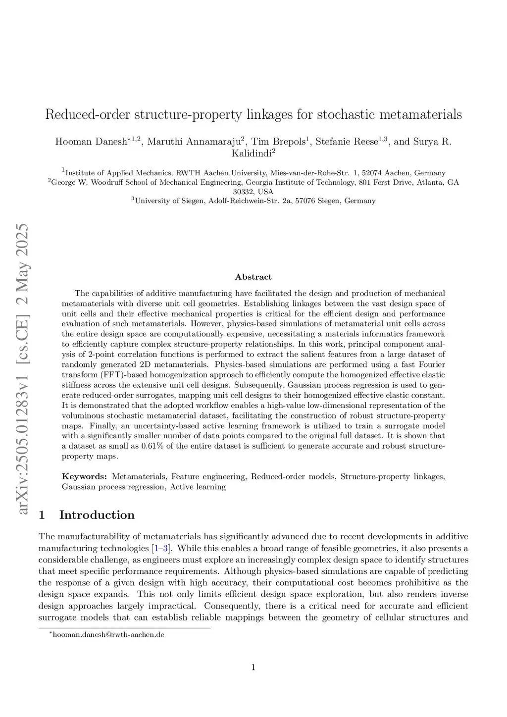 The capabilities of additive manufacturing have facilitated the design and production of mechanical metamaterials with diverse unit cell geometries. Establishing linkages between the vast design space of unit cells and their effective mechanical properties is critical for the efficient design and performance evaluation of such metamaterials. However, physics-based simulations of metamaterial unit cells across the entire design space are computationally expensive, necessitating a materials informatics framework to efficiently capture complex structure-property relationships. In this work, principal component analysis of 2-point correlation functions is performed to extract the salient features from a large dataset of randomly generated 2D metamaterials. Physics-based simulations are performed using a fast Fourier transform (FFT)-based homogenization approach to efficiently compute the homogenized effective elastic stiffness across the extensive unit cell designs. Subsequently, Gaussian process regression is used to generate reduced-order surrogates, mapping unit cell designs to their homogenized effective elastic constant. It is demonstrated that the adopted workflow enables a high-value low-dimensional representation of the voluminous stochastic metamaterial dataset, facilitating the construction of robust structure-property maps. Finally, an uncertainty-based active learning framework is utilized to train a surrogate model with a significantly smaller number of data points compared to the original full dataset. It is shown that a dataset as small as of the entire dataset is sufficient to generate accurate and robust structure-property maps.