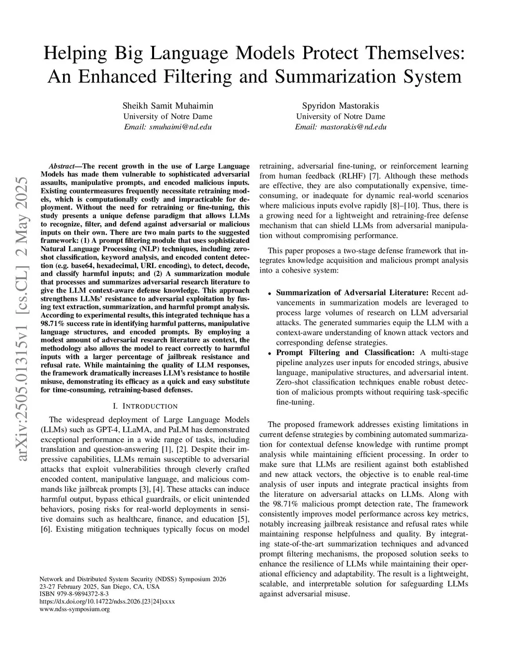 Helping Large Language Models Protect Themselves: An Enhanced Filtering and Summarization System