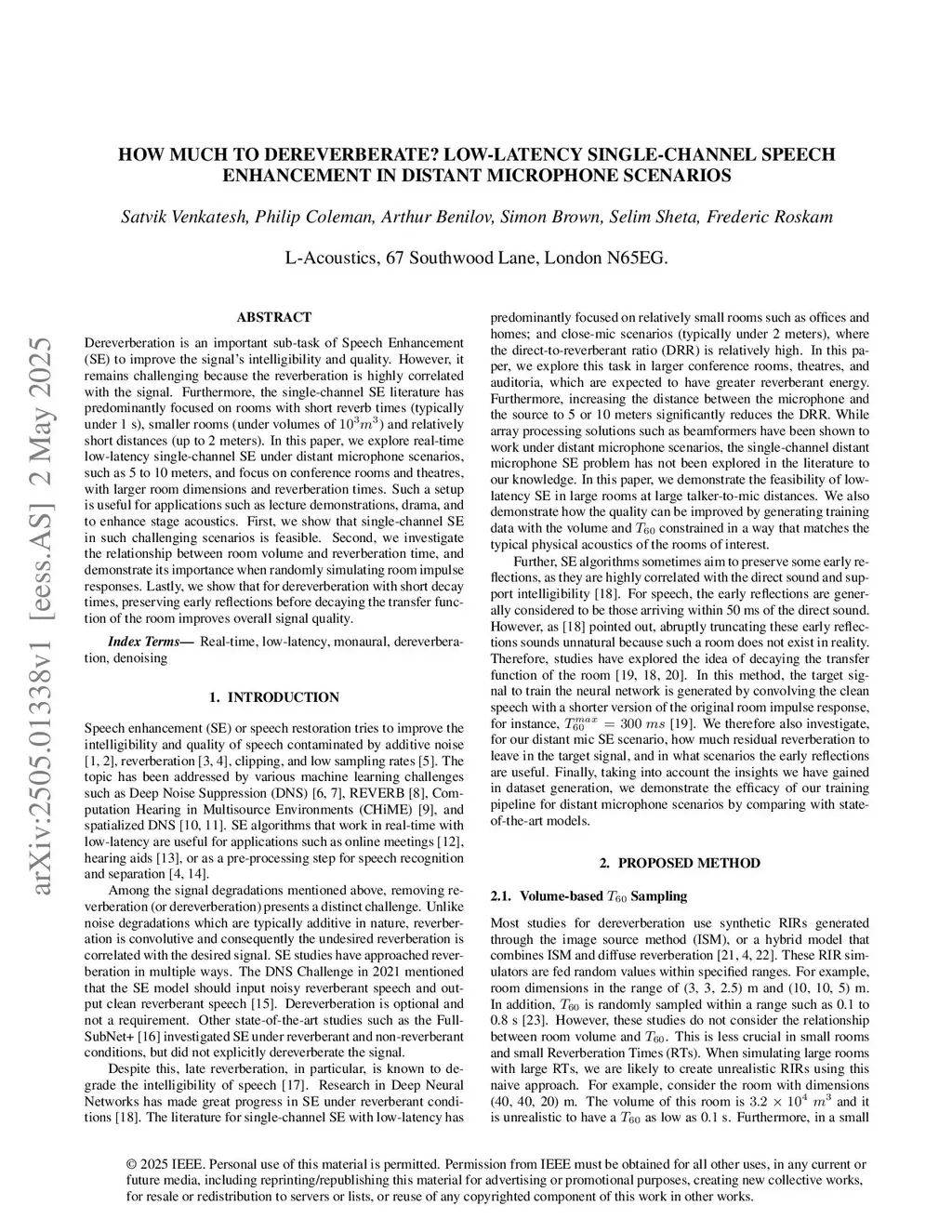 Dereverberation is an important sub-task of Speech Enhancement (SE) to improve the signal's intelligibility and quality. However, it remains challenging because the reverberation is highly correlated with the signal. Furthermore, the single-channel SE literature has predominantly focused on rooms with short reverb times (typically under 1 second), smaller rooms (under volumes of 1000 cubic meters) and relatively short distances (up to 2 meters). In this paper, we explore real-time low-latency single-channel SE under distant microphone scenarios, such as 5 to 10 meters, and focus on conference rooms and theatres, with larger room dimensions and reverberation times. Such a setup is useful for applications such as lecture demonstrations, drama, and to enhance stage acoustics. First, we show that single-channel SE in such challenging scenarios is feasible. Second, we investigate the relationship between room volume and reverberation time, and demonstrate its importance when randomly simulating room impulse responses. Lastly, we show that for dereverberation with short decay times, preserving early reflections before decaying the transfer function of the room improves overall signal quality.