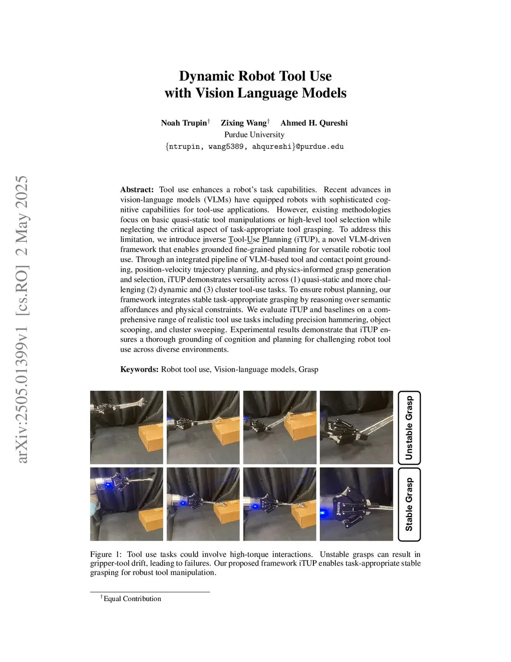 Tool use often fails not because robots misidentify tools, but because grasps cannot withstand task-induced wrench. Existing vision-language manipulation systems ground tools and contact regions from language yet select grasps under quasi-static or geometry-only assumptions. During interaction, inertial impulse and lever-arm amplification generate wrist torque and tangential loads that trigger slip and rotation. We introduce inverse Tool-use Planning (iTuP), which selects grasps by minimizing predicted interaction wrench along a task-conditioned trajectory. From rigid-body mechanics, we derive torque, slip, and alignment penalties, and train a Stable Dynamic Grasp Network (SDG-Net) to approximate these trajectory-conditioned costs for real-time scoring. Across hammering, sweeping, knocking, and reaching in simulation and on hardware, SDG-Net suppresses induced torque up to 17.6%, shifts grasps below empirically observed instability thresholds, and improves real-world success by 17.5% over a compositional baseline. Improvements concentrate where wrench amplification dominates, showing that robot tool use requires wrench-aware grasp selection, not perception alone.