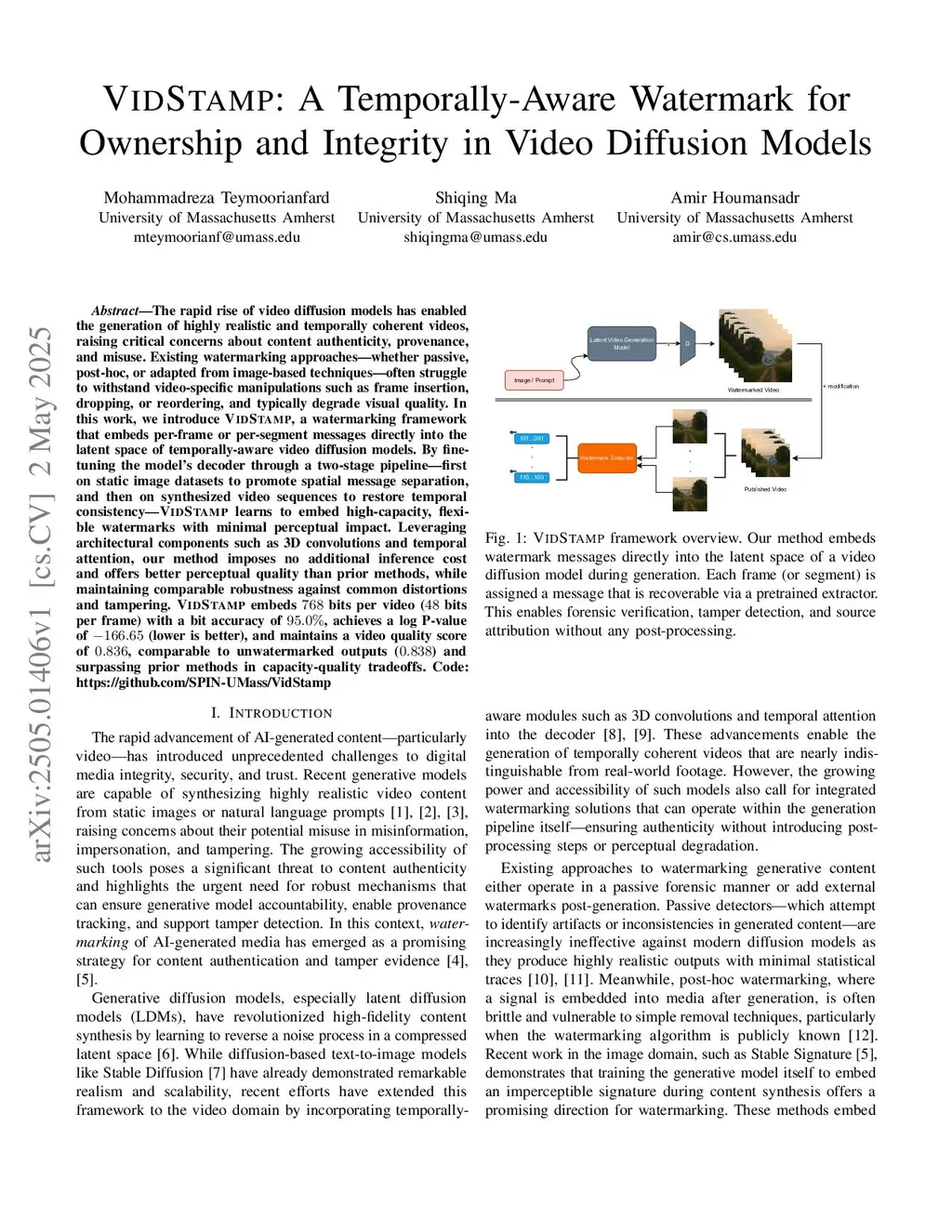 VIDSTAMP: A Temporally-Aware Watermark for Ownership and Integrity in Video Diffusion Models