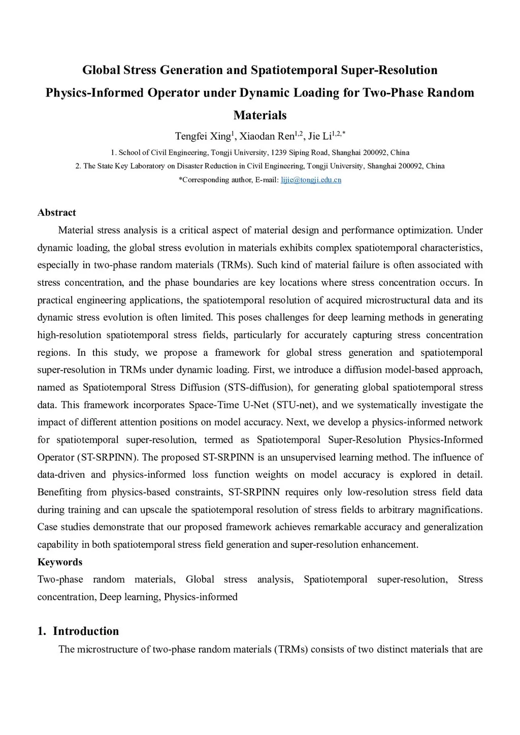 Material stress analysis is a critical aspect of material design and performance optimization. Under dynamic loading, the global stress evolution in materials exhibits complex spatiotemporal characteristics, especially in two-phase random materials (TRMs). Such kind of material failure is often associated with stress concentration, and the phase boundaries are key locations where stress concentration occurs. In practical engineering applications, the spatiotemporal resolution of acquired microstructural data and its dynamic stress evolution is often limited. This poses challenges for deep learning methods in generating high-resolution spatiotemporal stress fields, particularly for accurately capturing stress concentration regions. In this study, we propose a framework for global stress generation and spatiotemporal super-resolution in TRMs under dynamic loading. First, we introduce a diffusion model-based approach, named as Spatiotemporal Stress Diffusion (STS-diffusion), for generating global spatiotemporal stress data. This framework incorporates Space-Time U-Net (STU-net), and we systematically investigate the impact of different attention positions on model accuracy. Next, we develop a physics-informed network for spatiotemporal super-resolution, termed as Spatiotemporal Super-Resolution Physics-Informed Operator (ST-SRPINN). The proposed ST-SRPINN is an unsupervised learning method. The influence of data-driven and physics-informed loss function weights on model accuracy is explored in detail. Benefiting from physics-based constraints, ST-SRPINN requires only low-resolution stress field data during training and can upscale the spatiotemporal resolution of stress fields to arbitrary magnifications.