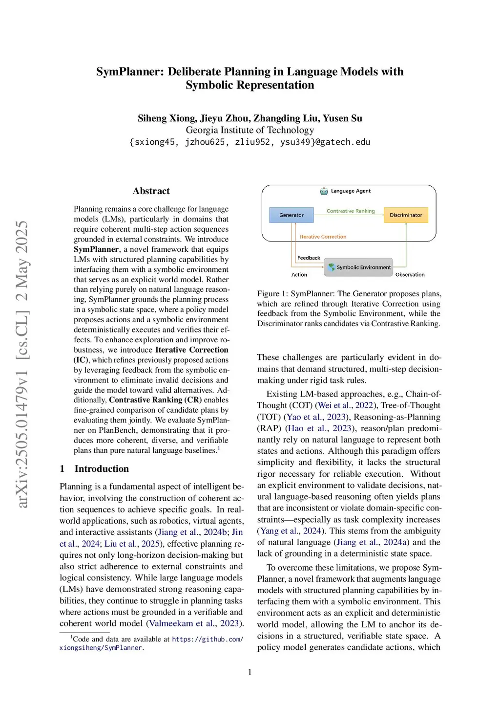 Planning remains a core challenge for large language models (LLMs), particularly in domains that require coherent multi-step action sequences grounded in external constraints. We introduce SymPlanner, a novel framework that equips LLMs with structured planning capabilities by interfacing them with a symbolic environment that serves as an explicit world model. Rather than relying purely on natural language reasoning, SymPlanner grounds the planning process in a symbolic state space, where a policy model proposes actions and a symbolic environment deterministically executes and verifies their effects. To enhance exploration and improve robustness, we introduce Iterative Correction (IC), which refines previously proposed actions by leveraging feedback from the symbolic environment to eliminate invalid decisions and guide the model toward valid alternatives. Additionally, Contrastive Ranking (CR) enables fine-grained comparison of candidate plans by evaluating them jointly. Conceptually, SymPlanner operationalizes two cognitive faculties: (i) error monitoring and repair via externalized feedback (IC) and (ii) preference formation among alternatives via pairwise comparison (CR), advancing cognitively plausible, symbol-grounded planning aligned with the rich structure in intelligent systems. We evaluate SymPlanner on PlanBench, demonstrating that it produces more coherent, diverse, and verifiable plans than pure natural language baselines.