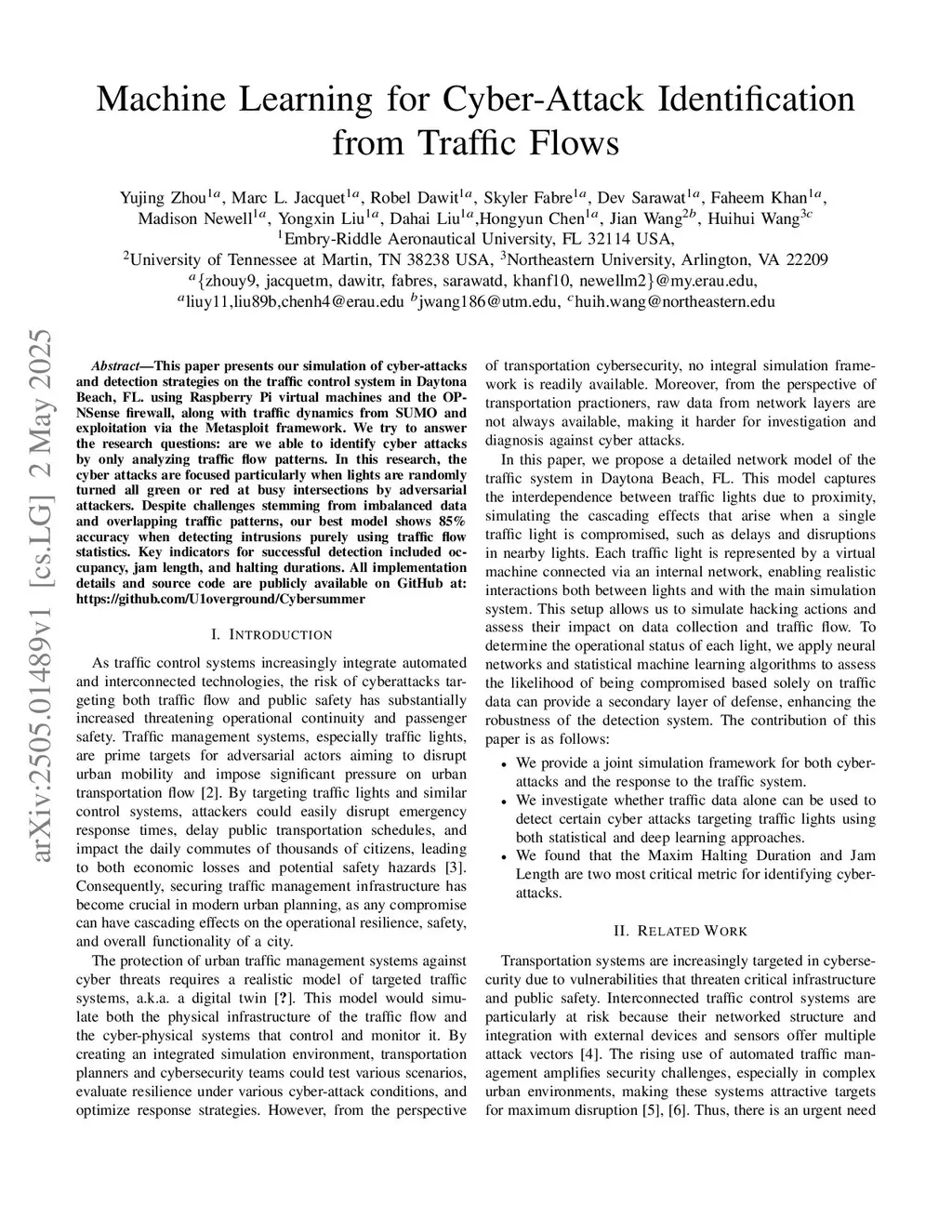 This paper presents our simulation of cyber-attacks and detection strategies on the traffic control system in Daytona Beach, FL. using Raspberry Pi virtual machines and the OPNSense firewall, along with traffic dynamics from SUMO and exploitation via the Metasploit framework. We try to answer the research questions: are we able to identify cyber attacks by only analyzing traffic flow patterns. In this research, the cyber attacks are focused particularly when lights are randomly turned all green or red at busy intersections by adversarial attackers. Despite challenges stemming from imbalanced data and overlapping traffic patterns, our best model shows 85\% accuracy when detecting intrusions purely using traffic flow statistics. Key indicators for successful detection included occupancy, jam length, and halting durations.