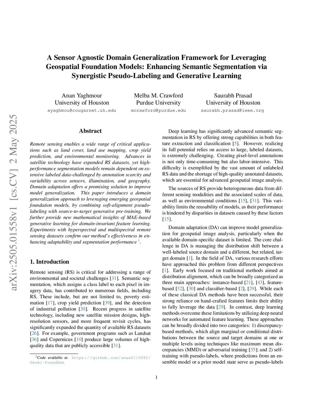 Remote sensing enables a wide range of critical applications such as land cover and land use mapping, crop yield prediction, and environmental monitoring. Advances in satellite technology have expanded remote sensing datasets, yet high-performance segmentation models remain dependent on extensive labeled data, challenged by annotation scarcity and variability across sensors, illumination, and geography. Domain adaptation offers a promising solution to improve model generalization. This paper introduces a domain generalization approach to leveraging emerging geospatial foundation models by combining soft-alignment pseudo-labeling with source-to-target generative pre-training. We further provide new mathematical insights into MAE-based generative learning for domain-invariant feature learning. Experiments with hyperspectral and multispectral remote sensing datasets confirm our method's effectiveness in enhancing adaptability and segmentation.