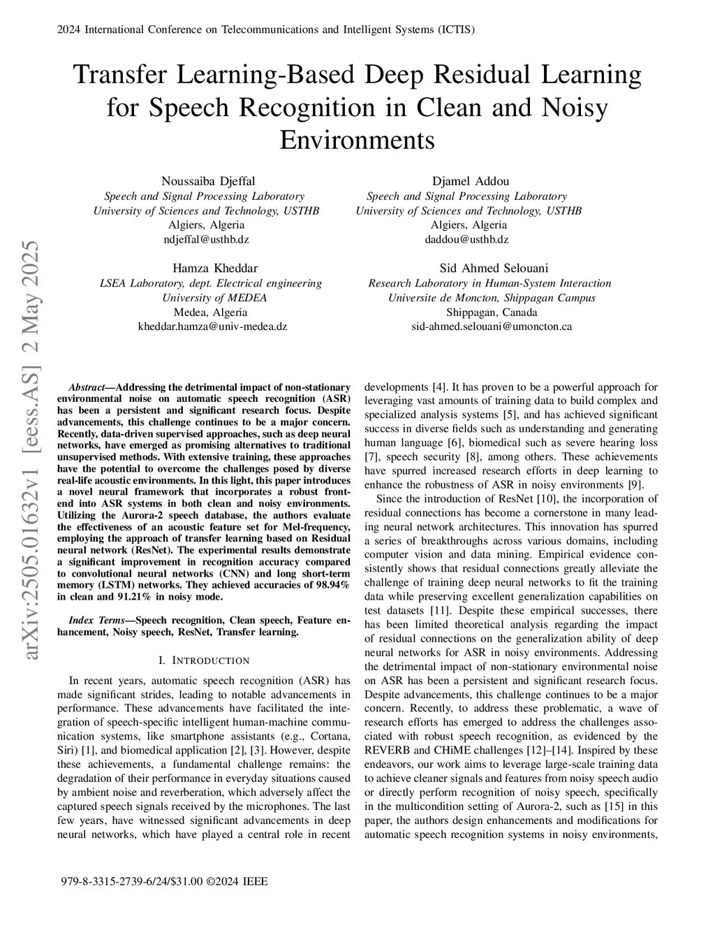 Transfer Learning-Based Deep Residual Learning for Speech Recognition in Clean and Noisy Environments