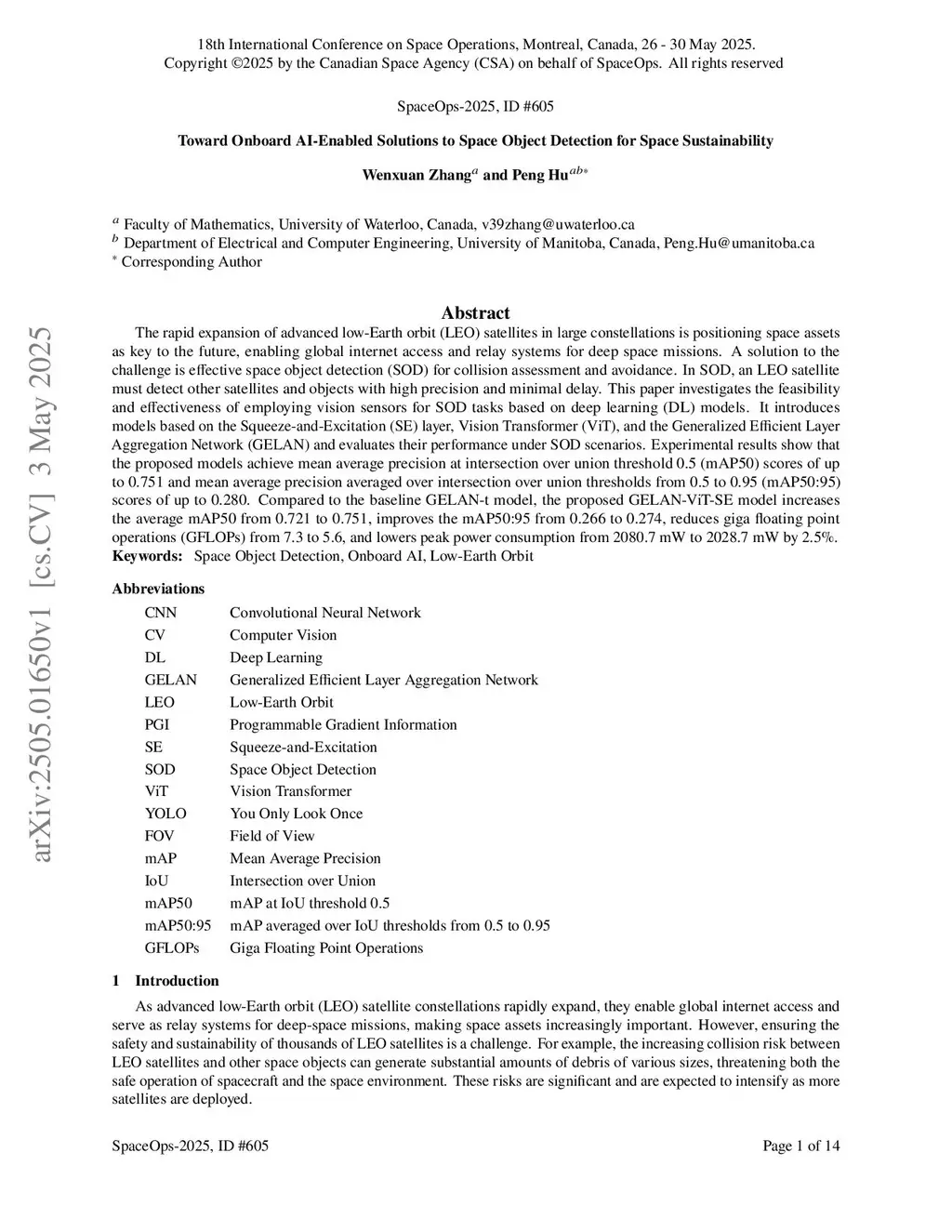 The rapid expansion of advanced low-Earth orbit (LEO) satellites in large constellations is positioning space assets as key to the future, enabling global internet access and relay systems for deep space missions. A solution to the challenge is effective space object detection (SOD) for collision assessment and avoidance. In SOD, an LEO satellite must detect other satellites and objects with high precision and minimal delay. This paper investigates the feasibility and effectiveness of employing vision sensors for SOD tasks based on deep learning (DL) models. It introduces models based on the Squeeze-and-Excitation (SE) layer, Vision Transformer (ViT), and the Generalized Efficient Layer Aggregation Network (GELAN) and evaluates their performance under SOD scenarios. Experimental results show that the proposed models achieve mean average precision at intersection over union threshold 0.5 (mAP50) scores of up to 0.751 and mean average precision averaged over intersection over union thresholds from 0.5 to 0.95 (mAP50:95) scores of up to 0.280. Compared to the baseline GELAN-t model, the proposed GELAN-ViT-SE model increases the average mAP50 from 0.721 to 0.751, improves the mAP50:95 from 0.266 to 0.274, reduces giga floating point operations (GFLOPs) from 7.3 to 5.6, and lowers peak power consumption from 2080.7 mW to 2028.7 mW by 2.5\%.