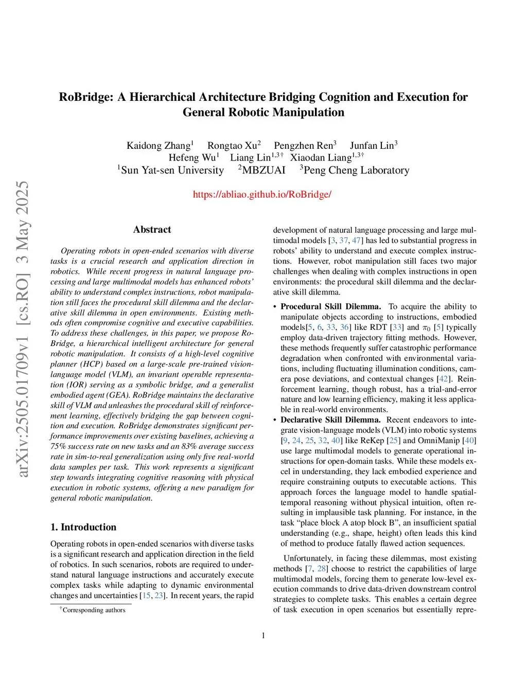 Operating robots in open-ended scenarios with diverse tasks is a crucial research and application direction in robotics. While recent progress in natural language processing and large multimodal models has enhanced robots' ability to understand complex instructions, robot manipulation still faces the procedural skill dilemma and the declarative skill dilemma in open environments. Existing methods often compromise cognitive and executive capabilities. To address these challenges, in this paper, we propose RoBridge, a hierarchical intelligent architecture for general robotic manipulation. It consists of a high-level cognitive planner (HCP) based on a large-scale pre-trained vision-language model (VLM), an invariant operable representation (IOR) serving as a symbolic bridge, and a generalist embodied agent (GEA). RoBridge maintains the declarative skill of VLM and unleashes the procedural skill of reinforcement learning, effectively bridging the gap between cognition and execution. RoBridge demonstrates significant performance improvements over existing baselines, achieving a 75% success rate on new tasks and an 83% average success rate in sim-to-real generalization using only five real-world data samples per task. This work represents a significant step towards integrating cognitive reasoning with physical execution in robotic systems, offering a new paradigm for general robotic manipulation.