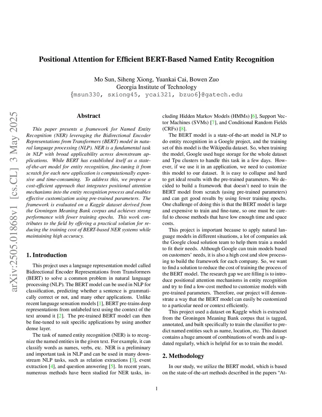 This paper presents a framework for Named Entity Recognition (NER) leveraging the Bidirectional Encoder Representations from Transformers (BERT) model in natural language processing (NLP). NER is a fundamental task in NLP with broad applicability across downstream applications. While BERT has established itself as a state-of-the-art model for entity recognition, fine-tuning it from scratch for each new application is computationally expensive and time-consuming. To address this, we propose a cost-efficient approach that integrates positional attention mechanisms into the entity recognition process and enables effective customization using pre-trained parameters. The framework is evaluated on a Kaggle dataset derived from the Groningen Meaning Bank corpus and achieves strong performance with fewer training epochs. This work contributes to the field by offering a practical solution for reducing the training cost of BERT-based NER systems while maintaining high accuracy.