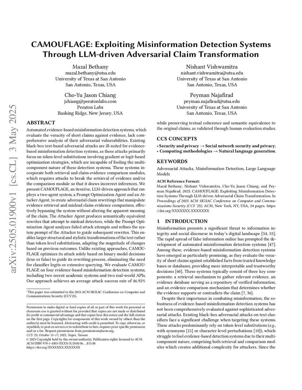 CAMOUFLAGE: Exploiting Misinformation Detection Systems Through LLM-driven Adversarial Claim Transformation