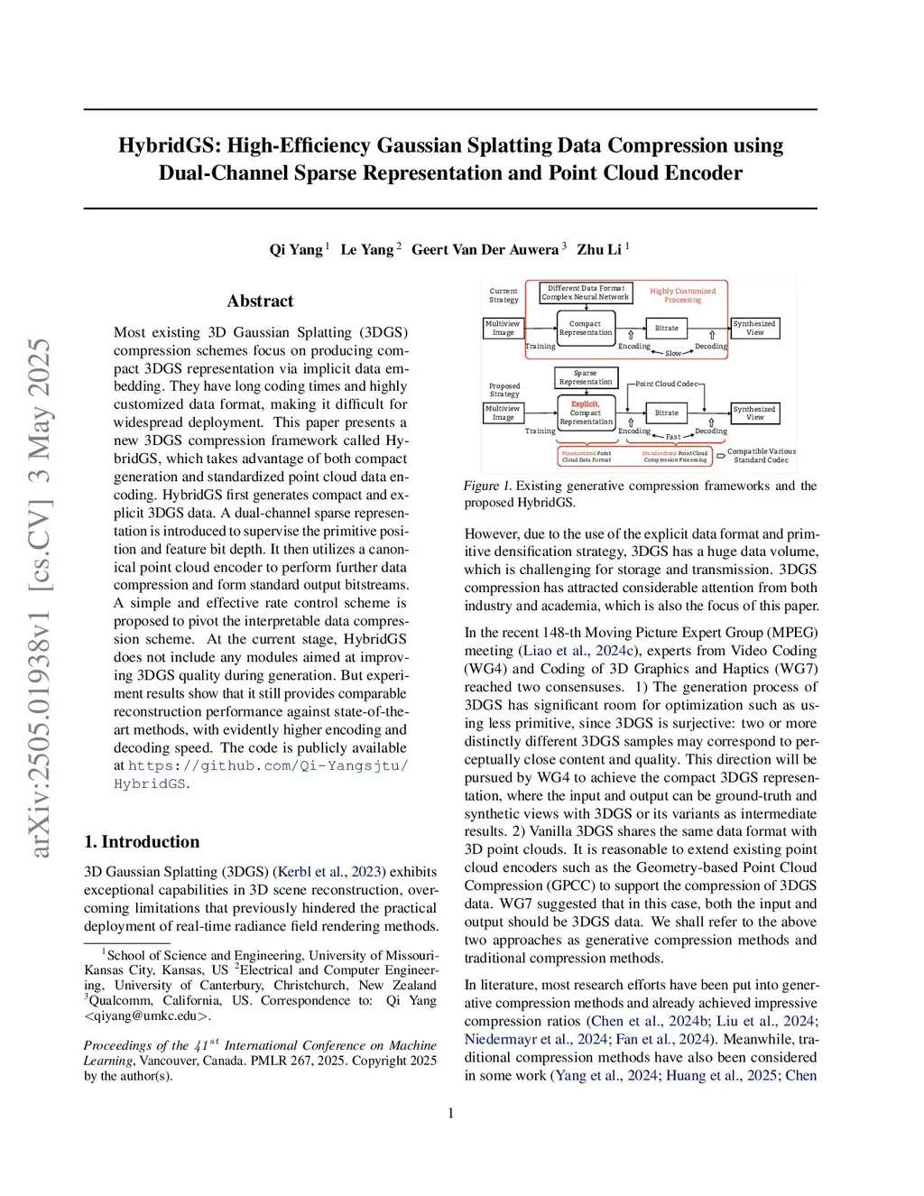 Most existing 3D Gaussian Splatting (3DGS) compression schemes focus on producing compact 3DGS representation via implicit data embedding. They have long coding times and highly customized data format, making it difficult for widespread deployment. This paper presents a new 3DGS compression framework called HybridGS, which takes advantage of both compact generation and standardized point cloud data encoding. HybridGS first generates compact and explicit 3DGS data. A dual-channel sparse representation is introduced to supervise the primitive position and feature bit depth. It then utilizes a canonical point cloud encoder to perform further data compression and form standard output bitstreams. A simple and effective rate control scheme is proposed to pivot the interpretable data compression scheme. At the current stage, HybridGS does not include any modules aimed at improving 3DGS quality during generation. But experiment results show that it still provides comparable reconstruction performance against state-of-the-art methods, with evidently higher encoding and decoding speed. The code is publicly available atthis https URL.