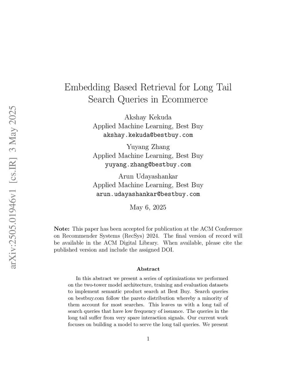 Embedding based retrieval for long tail search queries in ecommerce