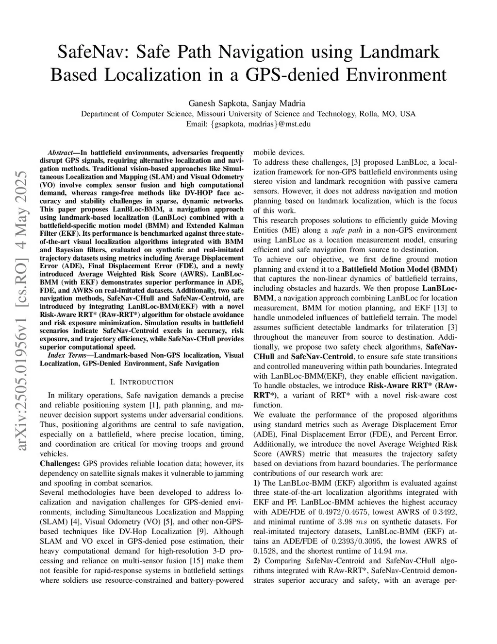 SafeNav: Safe Path Navigation using Landmark Based Localization in a GPS-denied Environment