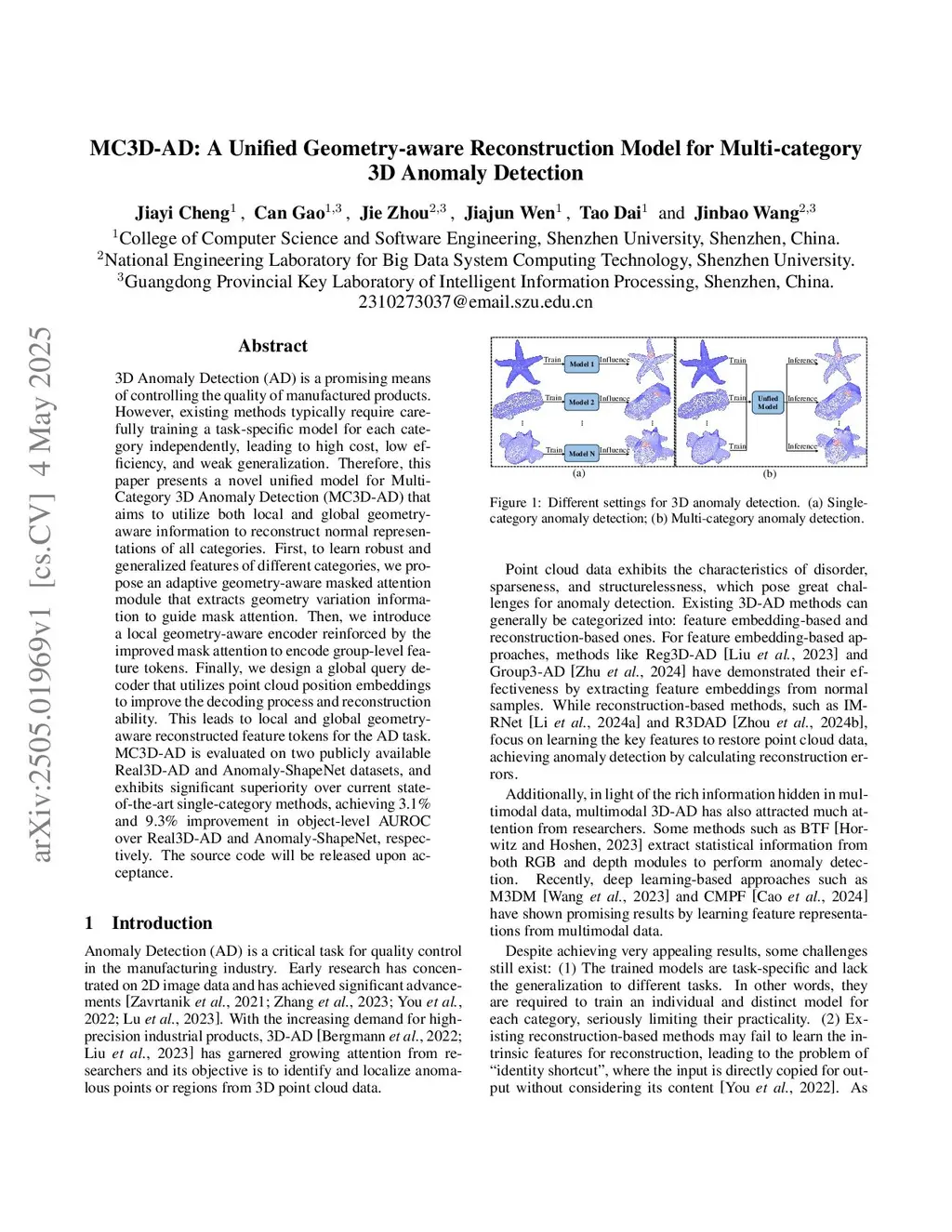 3D Anomaly Detection (AD) is a promising means of controlling the quality of manufactured products. However, existing methods typically require carefully training a task-specific model for each category independently, leading to high cost, low efficiency, and weak generalization. Therefore, this paper presents a novel unified model for Multi-Category 3D Anomaly Detection (MC3D-AD) that aims to utilize both local and global geometry-aware information to reconstruct normal representations of all categories. First, to learn robust and generalized features of different categories, we propose an adaptive geometry-aware masked attention module that extracts geometry variation information to guide mask attention. Then, we introduce a local geometry-aware encoder reinforced by the improved mask attention to encode group-level feature tokens. Finally, we design a global query decoder that utilizes point cloud position embeddings to improve the decoding process and reconstruction ability. This leads to local and global geometry-aware reconstructed feature tokens for the AD task. MC3D-AD is evaluated on two publicly available Real3D-AD and Anomaly-ShapeNet datasets, and exhibits significant superiority over current state-of-the-art single-category methods, achieving 3.1\% and 9.3\% improvement in object-level AUROC over Real3D-AD and Anomaly-ShapeNet, respectively. The code is available atthis https URL.