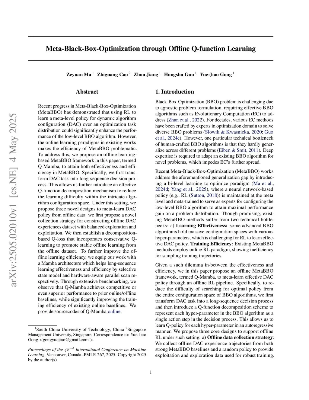 Recent progress in Meta-Black-Box-Optimization (MetaBBO) has demonstrated that using RL to learn a meta-level policy for dynamic algorithm configuration (DAC) over an optimization task distribution could significantly enhance the performance of the low-level BBO algorithm. However, the online learning paradigms in existing works makes the efficiency of MetaBBO problematic. To address this, we propose an offline learning-based MetaBBO framework in this paper, termed Q-Mamba, to attain both effectiveness and efficiency in MetaBBO. Specifically, we first transform DAC task into long-sequence decision process. This allows us further introduce an effective Q-function decomposition mechanism to reduce the learning difficulty within the intricate algorithm configuration space. Under this setting, we propose three novel designs to meta-learn DAC policy from offline data: we first propose a novel collection strategy for constructing offline DAC experiences dataset with balanced exploration and exploitation. We then establish a decomposition-based Q-loss that incorporates conservative Q-learning to promote stable offline learning from the offline dataset. To further improve the offline learning efficiency, we equip our work with a Mamba architecture which helps long-sequence learning effectiveness and efficiency by selective state model and hardware-aware parallel scan respectively. Through extensive benchmarking, we observe that Q-Mamba achieves competitive or even superior performance to prior online/offline baselines, while significantly improving the training efficiency of existing online baselines. We provide sourcecodes of Q-Mamba atthis https URL.