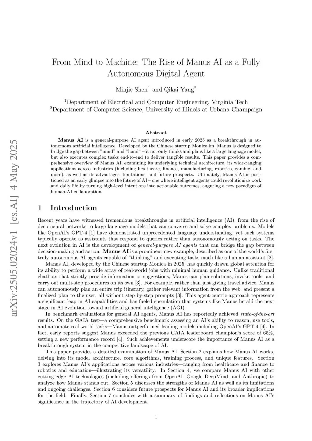 Manus AI is a general-purpose AI agent introduced in early 2025, marking a significant advancement in autonomous artificial intelligence. Developed by the Chinese startupthis http URL, Manus is designed to bridge the gap between "mind" and "hand" - combining the reasoning and planning capabilities of large language models with the ability to execute complex, end-to-end tasks that produce tangible outcomes. This paper presents a comprehensive overview of Manus AI, exploring its core technical architecture, diverse applications across sectors such as healthcare, finance, manufacturing, robotics, and gaming, as well as its key strengths, current limitations, and future potential. Positioned as a preview of what lies ahead, Manus AI represents a shift toward intelligent agents that can translate high-level intentions into real-world actions, heralding a new era of human-AI collaboration.