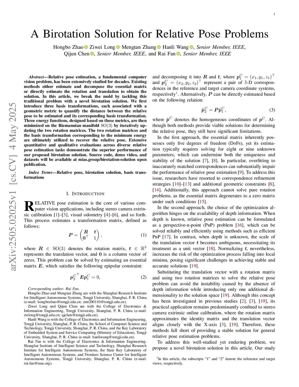 Relative pose estimation, a fundamental computer vision problem, has been extensively studied for decades. Existing methods either estimate and decompose the essential matrix or directly estimate the rotation and translation to obtain the solution. In this article, we break the mold by tackling this traditional problem with a novel birotation solution. We first introduce three basis transformations, each associated with a geometric metric to quantify the distance between the relative pose to be estimated and its corresponding basis transformation. Three energy functions, designed based on these metrics, are then minimized on the Riemannian manifold by iteratively updating the two rotation matrices. The two rotation matrices and the basis transformation corresponding to the minimum energy are ultimately utilized to recover the relative pose. Extensive quantitative and qualitative evaluations across diverse relative pose estimation tasks demonstrate the superior performance of our proposed birotation solution. Source code, demo video, and datasets will be available at \href{this https URL}{this http URL} upon publication.