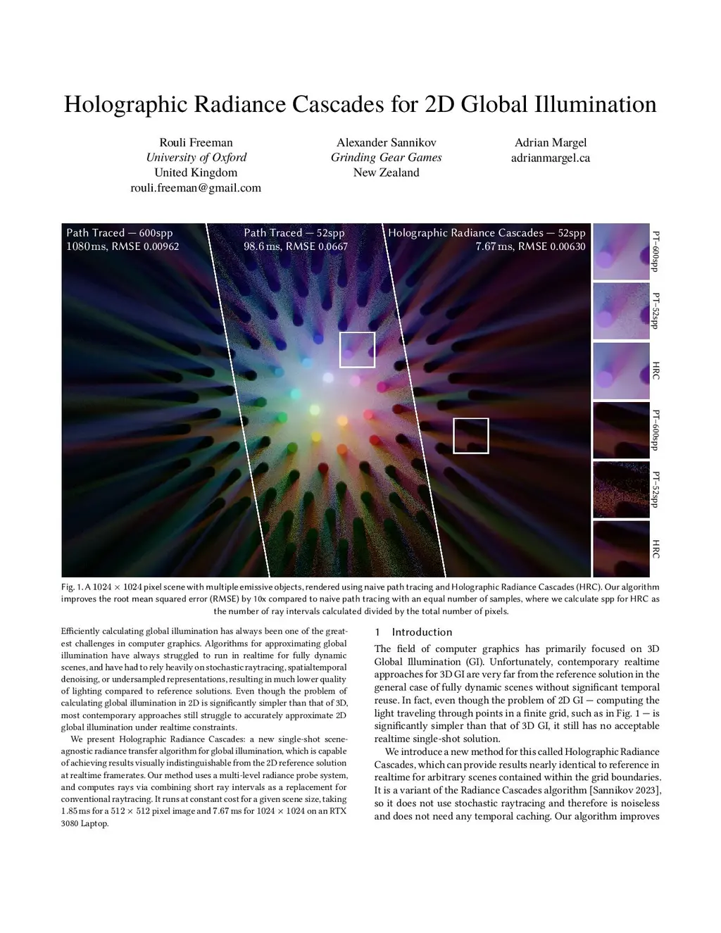 Efficiently calculating global illumination has always been one of the greatest challenges in computer graphics. Algorithms for approximating global illumination have always struggled to run in realtime for fully dynamic scenes, and have had to rely heavily on stochastic raytracing, spatialtemporal denoising, or undersampled representations, resulting in much lower quality of lighting compared to reference solutions. Even though the problem of calculating global illumination in 2D is significantly simpler than that of 3D, most contemporary approaches still struggle to accurately approximate 2D global illumination under realtime constraints.We present Holographic Radiance Cascades: a new single-shot scene-agnostic radiance transfer algorithm for global illumination, which is capable of achieving results visually indistinguishable from the 2D reference solution at realtime framerates. Our method uses a multi-level radiance probe system, and computes rays via combining short ray intervals as a replacement for conventional raytracing. It runs at constant cost for a given scene size, taking 1.85ms for a 512x512 pixel image and 7.67ms for 1024x1024 on an RTX 3080 Laptop.