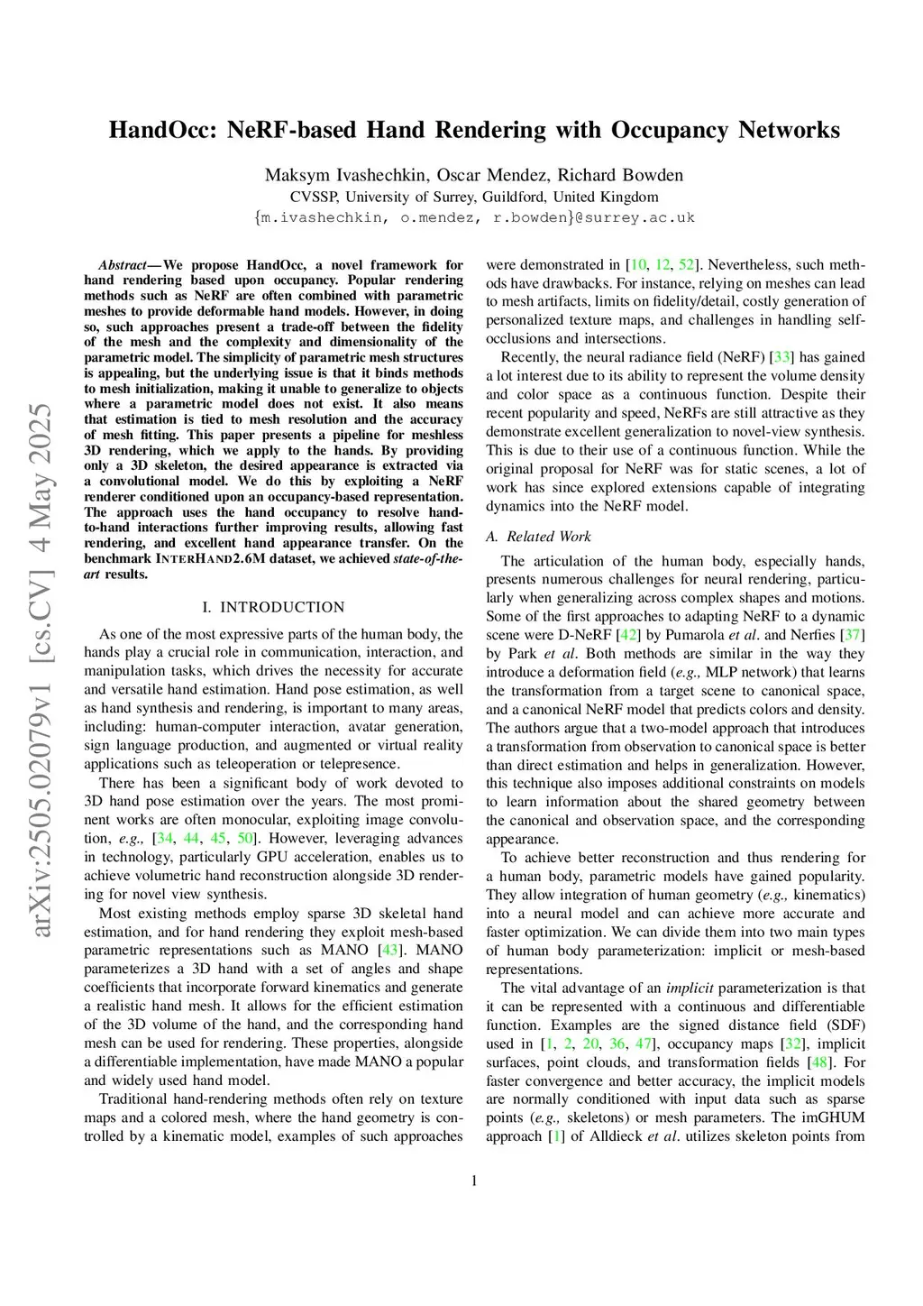 We propose HandOcc, a novel framework for hand rendering based upon occupancy. Popular rendering methods such as NeRF are often combined with parametric meshes to provide deformable hand models. However, in doing so, such approaches present a trade-off between the fidelity of the mesh and the complexity and dimensionality of the parametric model. The simplicity of parametric mesh structures is appealing, but the underlying issue is that it binds methods to mesh initialization, making it unable to generalize to objects where a parametric model does not exist. It also means that estimation is tied to mesh resolution and the accuracy of mesh fitting. This paper presents a pipeline for meshless 3D rendering, which we apply to the hands. By providing only a 3D skeleton, the desired appearance is extracted via a convolutional model. We do this by exploiting a NeRF renderer conditioned upon an occupancy-based representation. The approach uses the hand occupancy to resolve hand-to-hand interactions further improving results, allowing fast rendering, and excellent hand appearance transfer. On the benchmark InterHand2.6M dataset, we achieved state-of-the-art results.