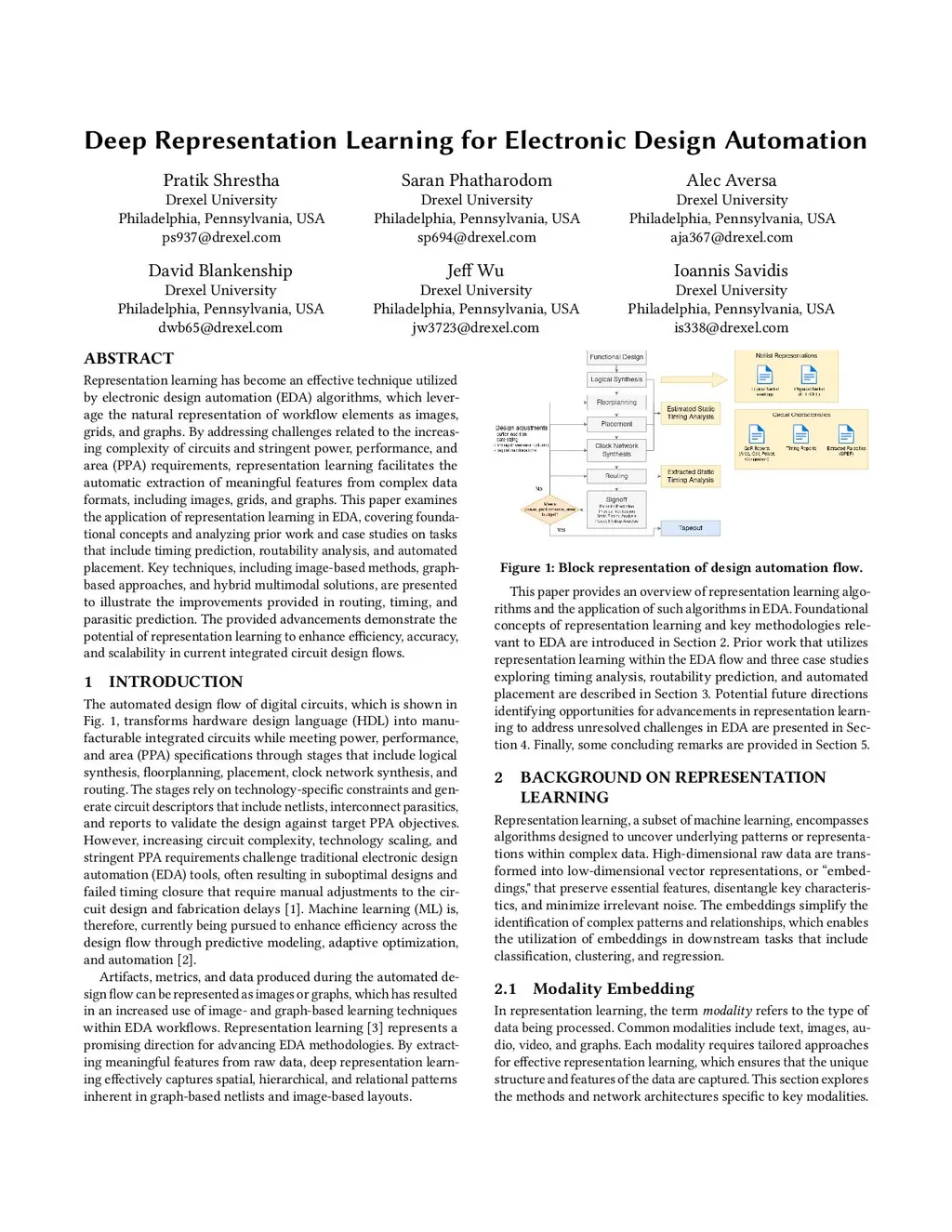 Representation learning has become an effective technique utilized by electronic design automation (EDA) algorithms, which leverage the natural representation of workflow elements as images, grids, and graphs. By addressing challenges related to the increasing complexity of circuits and stringent power, performance, and area (PPA) requirements, representation learning facilitates the automatic extraction of meaningful features from complex data formats, including images, grids, and graphs. This paper examines the application of representation learning in EDA, covering foundational concepts and analyzing prior work and case studies on tasks that include timing prediction, routability analysis, and automated placement. Key techniques, including image-based methods, graph-based approaches, and hybrid multimodal solutions, are presented to illustrate the improvements provided in routing, timing, and parasitic prediction. The provided advancements demonstrate the potential of representation learning to enhance efficiency, accuracy, and scalability in current integrated circuit design flows.