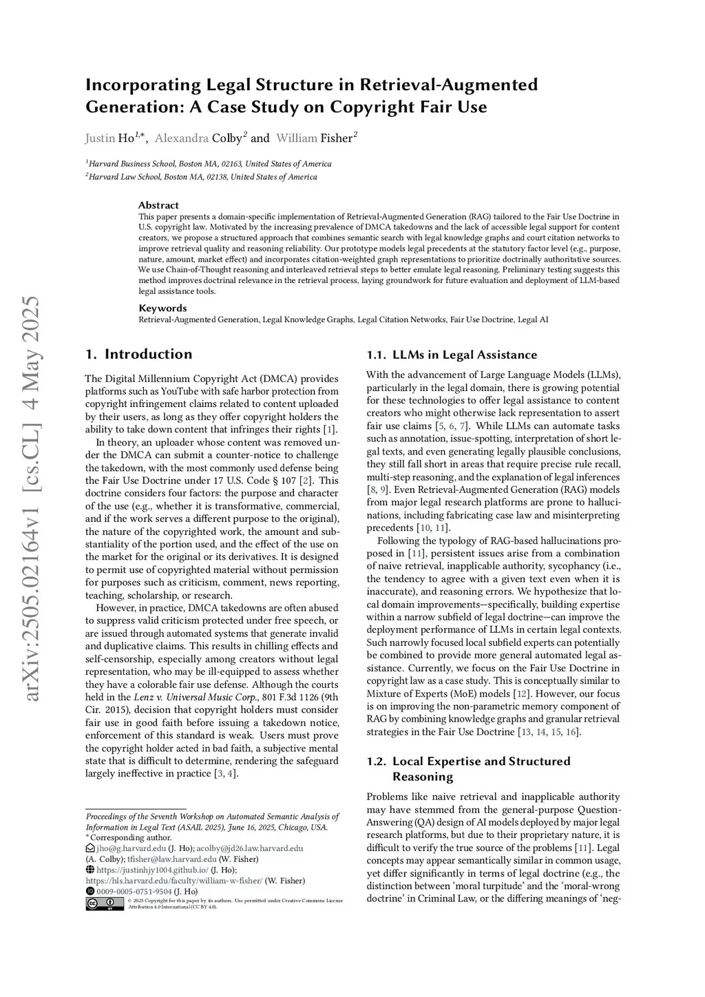 This paper presents a domain-specific implementation of Retrieval-Augmented Generation (RAG) tailored to the Fair Use Doctrine in U.S. copyright law. Motivated by the increasing prevalence of DMCA takedowns and the lack of accessible legal support for content creators, we propose a structured approach that combines semantic search with legal knowledge graphs and court citation networks to improve retrieval quality and reasoning reliability. Our prototype models legal precedents at the statutory factor level (e.g., purpose, nature, amount, market effect) and incorporates citation-weighted graph representations to prioritize doctrinally authoritative sources. We use Chain-of-Thought reasoning and interleaved retrieval steps to better emulate legal reasoning. Preliminary testing suggests this method improves doctrinal relevance in the retrieval process, laying groundwork for future evaluation and deployment of LLM-based legal assistance tools.