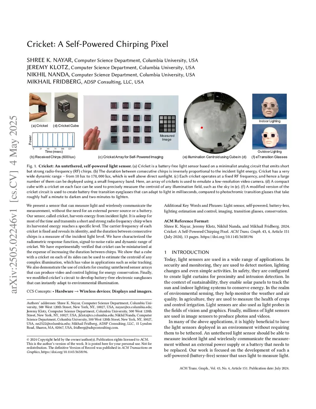 We present a sensor that can measure light and wirelessly communicate the measurement, without the need for an external power source or a battery. Our sensor, called cricket, harvests energy from incident light. It is asleep for most of the time and transmits a short and strong radio frequency chirp when its harvested energy reaches a specific level. The carrier frequency of each cricket is fixed and reveals its identity, and the duration between consecutive chirps is a measure of the incident light level. We have characterized the radiometric response function, signal-to-noise ratio and dynamic range of cricket. We have experimentally verified that cricket can be miniaturized at the expense of increasing the duration between chirps. We show that a cube with a cricket on each of its sides can be used to estimate the centroid of any complex illumination, which has value in applications such as solar tracking. We also demonstrate the use of crickets for creating untethered sensor arrays that can produce video and control lighting for energy conservation. Finally, we modified cricket's circuit to develop battery-free electronic sunglasses that can instantly adapt to environmental illumination.