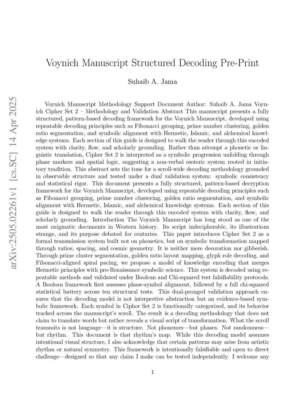 This paper introduces a structured decoding framework for the Voynich Manuscript, based on mathematical rhythm, symbolic transformation, and glyph-level recursion. Rather than interpret symbols phonetically, this method decodes them by structural roles and spatial pacing. Using scroll-wide sequencing, the system tracks prime number grouping, Fibonacci clustering, and golden ratio alignment. These symbolic structures are validated using a ten-part chi-squared test suite and Boolean logic. The method is falsifiable and reproducible. Scroll sections like f57v, f88v, and f91r are used to demonstrate glyph flow, breath-segment patterns, and tri-dot alignment. This decoding strategy challenges assumptions about pre-phonetic manuscripts and proposes a new lens for interpreting symbolic logic.