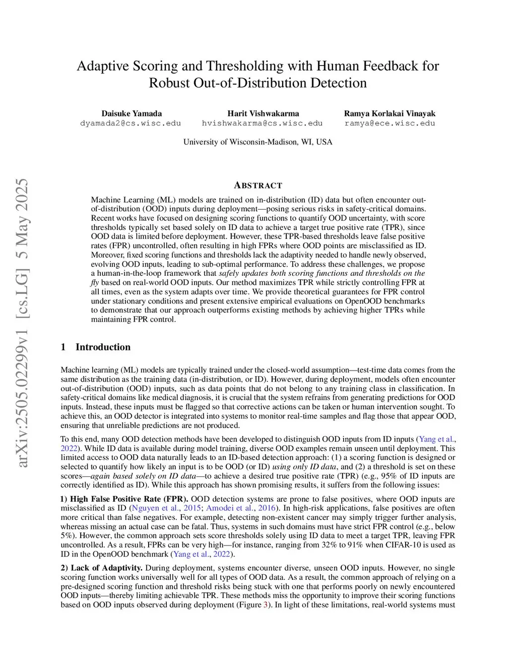 Machine Learning (ML) models are trained on in-distribution (ID) data but often encounter out-of-distribution (OOD) inputs during deployment -- posing serious risks in safety-critical domains. Recent works have focused on designing scoring functions to quantify OOD uncertainty, with score thresholds typically set based solely on ID data to achieve a target true positive rate (TPR), since OOD data is limited before deployment. However, these TPR-based thresholds leave false positive rates (FPR) uncontrolled, often resulting in high FPRs where OOD points are misclassified as ID. Moreover, fixed scoring functions and thresholds lack the adaptivity needed to handle newly observed, evolving OOD inputs, leading to sub-optimal performance. To address these challenges, we propose a human-in-the-loop framework that \emph{safely updates both scoring functions and thresholds on the fly} based on real-world OOD inputs. Our method maximizes TPR while strictly controlling FPR at all times, even as the system adapts over time. We provide theoretical guarantees for FPR control under stationary conditions and present extensive empirical evaluations on OpenOOD benchmarks to demonstrate that our approach outperforms existing methods by achieving higher TPRs while maintaining FPR control.
