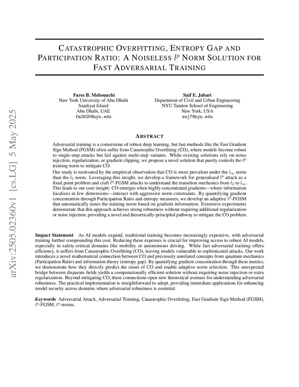 Catastrophic Overfitting, Entropy Gap and Participation Ratio: A Noiseless Norm Solution for Fast Adversarial Training