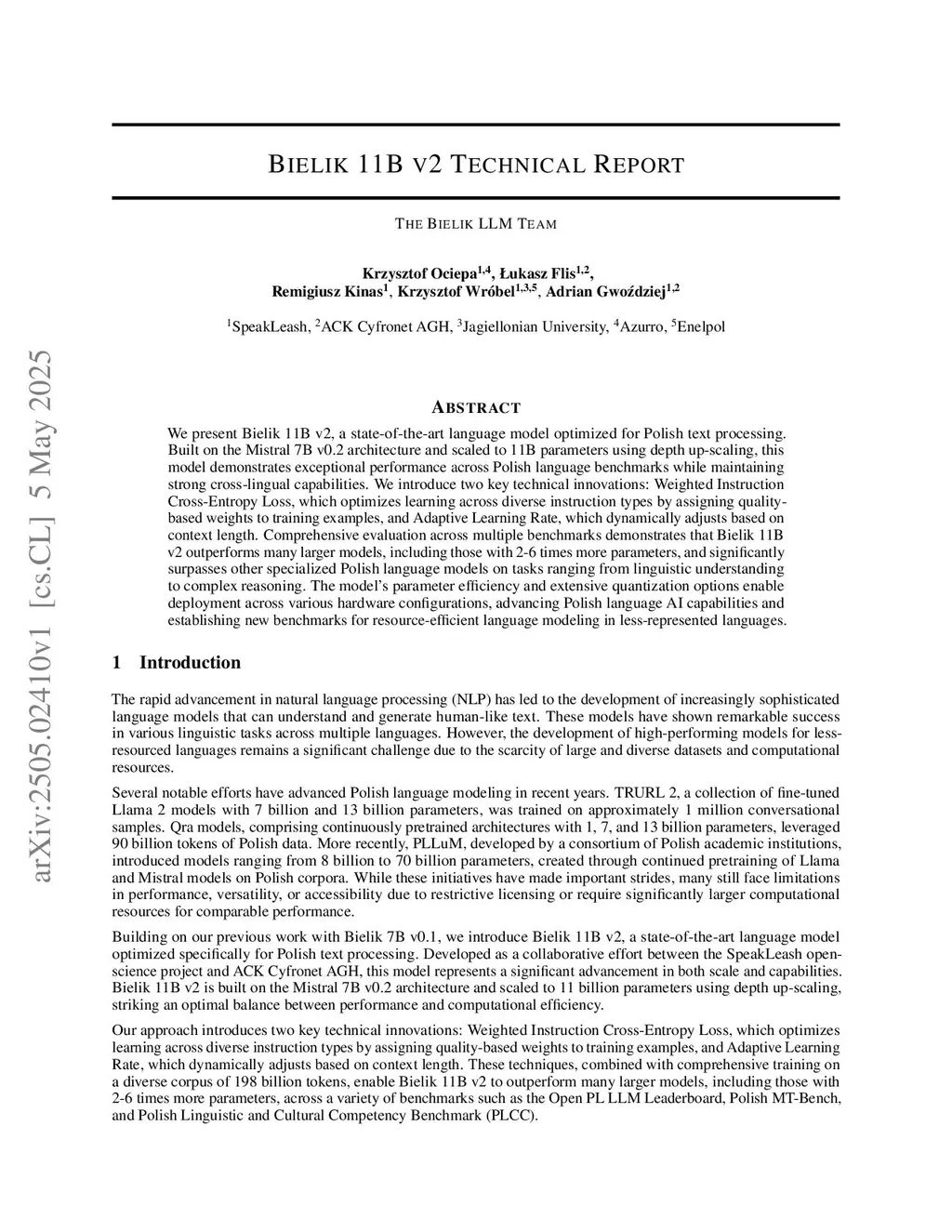 We present Bielik 11B v2, a state-of-the-art language model optimized for Polish text processing. Built on the Mistral 7B v0.2 architecture and scaled to 11B parameters using depth up-scaling, this model demonstrates exceptional performance across Polish language benchmarks while maintaining strong cross-lingual capabilities. We introduce two key technical innovations: Weighted Instruction Cross-Entropy Loss, which optimizes learning across diverse instruction types by assigning quality-based weights to training examples, and Adaptive Learning Rate, which dynamically adjusts based on context length. Comprehensive evaluation across multiple benchmarks demonstrates that Bielik 11B v2 outperforms many larger models, including those with 2-6 times more parameters, and significantly surpasses other specialized Polish language models on tasks ranging from linguistic understanding to complex reasoning. The model's parameter efficiency and extensive quantization options enable deployment across various hardware configurations, advancing Polish language AI capabilities and establishing new benchmarks for resource-efficient language modeling in less-represented languages.