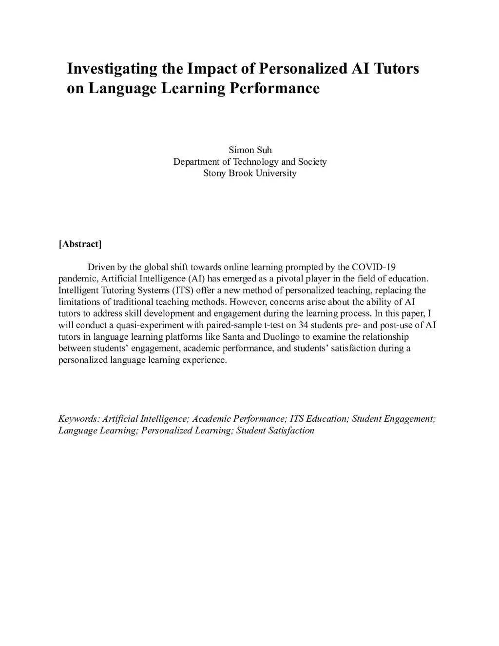 Driven by the global shift towards online learning prompted by the COVID 19 pandemic, Artificial Intelligence has emerged as a pivotal player in the field of education. Intelligent Tutoring Systems offer a new method of personalized teaching, replacing the limitations of traditional teaching methods. However, concerns arise about the ability of AI tutors to address skill development and engagement during the learning process. In this paper, I will conduct a quasi experiment with paired sample t test on 34 students pre and post use of AI tutors in language learning platforms like Santa and Duolingo to examine the relationship between students engagement, academic performance, and students satisfaction during a personalized language learning experience.