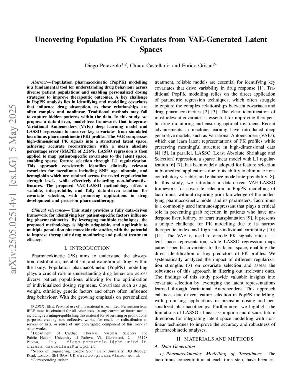 Population pharmacokinetic (PopPK) modelling is a fundamental tool for understanding drug behaviour across diverse patient populations and enabling personalized dosing strategies to improve therapeutic outcomes. A key challenge in PopPK analysis lies in identifying and modelling covariates that influence drug absorption, as these relationships are often complex and nonlinear. Traditional methods may fail to capture hidden patterns within the data. In this study, we propose a data-driven, model-free framework that integrates Variational Autoencoders (VAEs) deep learning model and LASSO regression to uncover key covariates from simulated tacrolimus pharmacokinetic (PK) profiles. The VAE compresses high-dimensional PK signals into a structured latent space, achieving accurate reconstruction with a mean absolute percentage error (MAPE) of 2.26%. LASSO regression is then applied to map patient-specific covariates to the latent space, enabling sparse feature selection through L1 regularization. This approach consistently identifies clinically relevant covariates for tacrolimus including SNP, age, albumin, and hemoglobin which are retained across the tested regularization strength levels, while effectively discarding non-informative features. The proposed VAE-LASSO methodology offers a scalable, interpretable, and fully data-driven solution for covariate selection, with promising applications in drug development and precision pharmacotherapy.