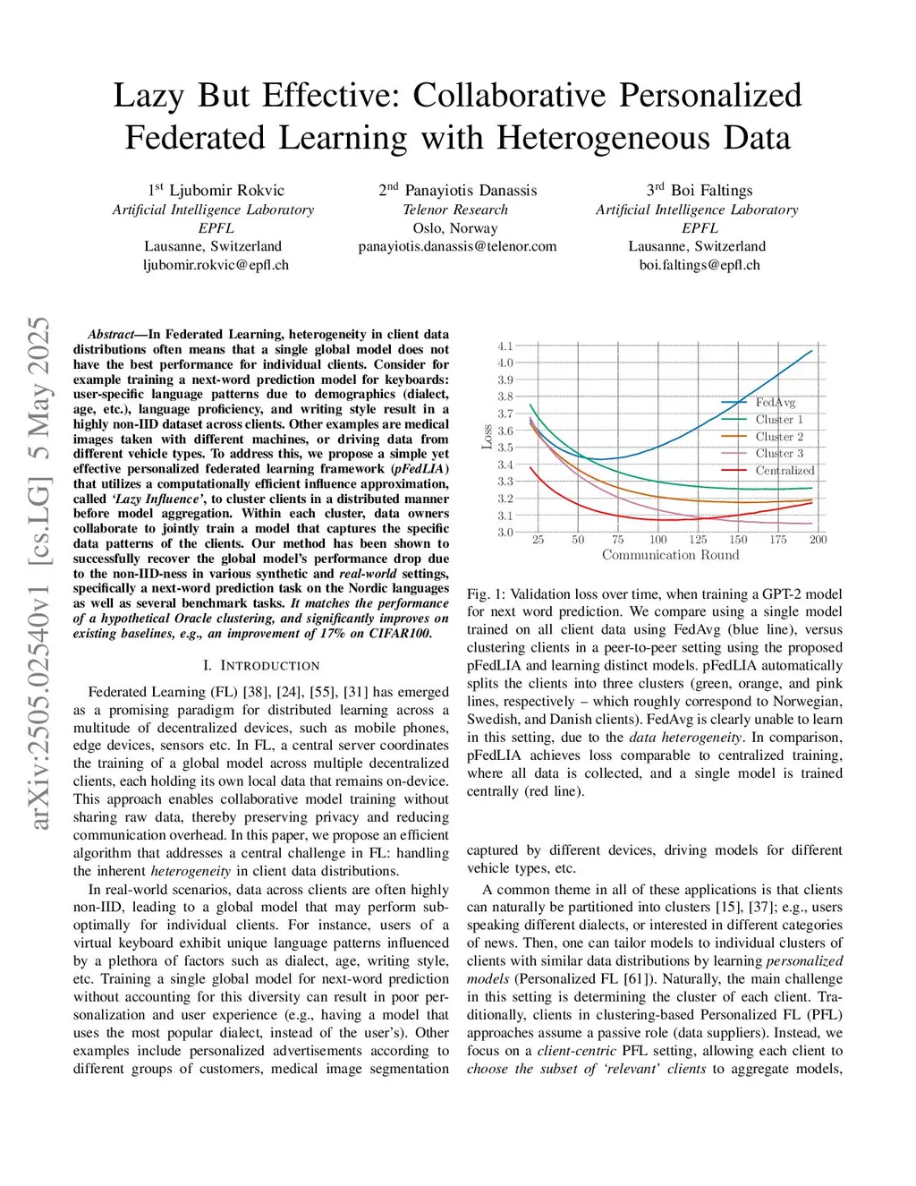 In Federated Learning, heterogeneity in client data distributions often means that a single global model does not have the best performance for individual clients. Consider for example training a next-word prediction model for keyboards: user-specific language patterns due to demographics (dialect, age, etc.), language proficiency, and writing style result in a highly non-IID dataset across clients. Other examples are medical images taken with different machines, or driving data from different vehicle types. To address this, we propose a simple yet effective personalized federated learning framework (pFedLIA) that utilizes a computationally efficient influence approximation, called `Lazy Influence', to cluster clients in a distributed manner before model aggregation. Within each cluster, data owners collaborate to jointly train a model that captures the specific data patterns of the clients. Our method has been shown to successfully recover the global model's performance drop due to the non-IID-ness in various synthetic and real-world settings, specifically a next-word prediction task on the Nordic languages as well as several benchmark tasks. It matches the performance of a hypothetical Oracle clustering, and significantly improves on existing baselines, e.g., an improvement of 17% on CIFAR100.