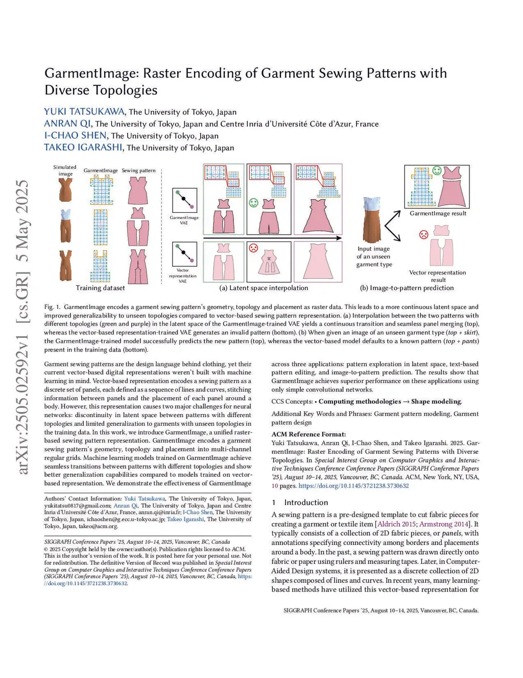 Garment sewing patterns are the design language behind clothing, yet their current vector-based digital representations weren't built with machine learning in mind. Vector-based representation encodes a sewing pattern as a discrete set of panels, each defined as a sequence of lines and curves, stitching information between panels and the placement of each panel around a body. However, this representation causes two major challenges for neural networks: discontinuity in latent space between patterns with different topologies and limited generalization to garments with unseen topologies in the training data. In this work, we introduce GarmentImage, a unified raster-based sewing pattern representation. GarmentImage encodes a garment sewing pattern's geometry, topology and placement into multi-channel regular grids. Machine learning models trained on GarmentImage achieve seamless transitions between patterns with different topologies and show better generalization capabilities compared to models trained on vector-based representation. We demonstrate the effectiveness of GarmentImage across three applications: pattern exploration in latent space, text-based pattern editing, and image-to-pattern prediction. The results show that GarmentImage achieves superior performance on these applications using only simple convolutional networks.