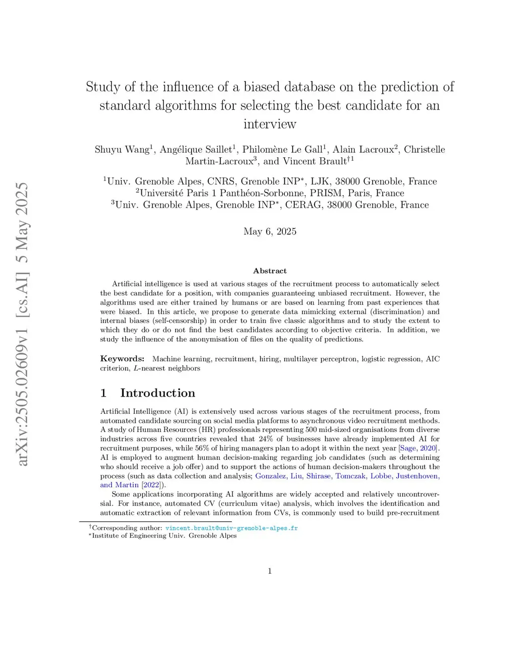 Study of the influence of a biased database on the prediction of standard algorithms for selecting the best candidate for an interview