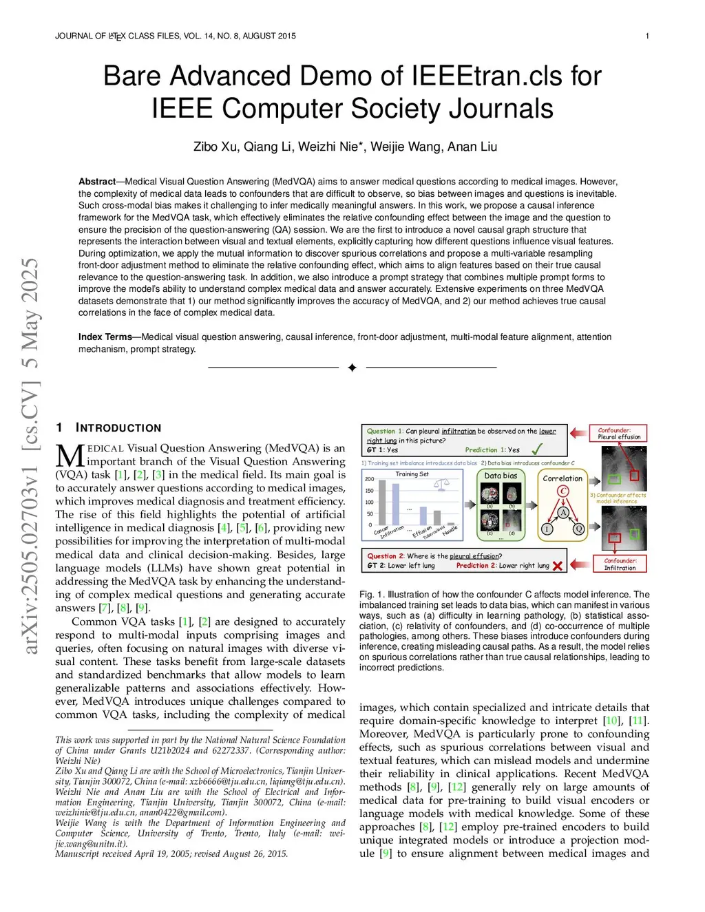 Medical Visual Question Answering (MedVQA) aims to answer medical questions according to medical images. However, the complexity of medical data leads to confounders that are difficult to observe, so bias between images and questions is inevitable. Such cross-modal bias makes it challenging to infer medically meaningful answers. In this work, we propose a causal inference framework for the MedVQA task, which effectively eliminates the relative confounding effect between the image and the question to ensure the precision of the question-answering (QA) session. We are the first to introduce a novel causal graph structure that represents the interaction between visual and textual elements, explicitly capturing how different questions influence visual features. During optimization, we apply the mutual information to discover spurious correlations and propose a multi-variable resampling front-door adjustment method to eliminate the relative confounding effect, which aims to align features based on their true causal relevance to the question-answering task. In addition, we also introduce a prompt strategy that combines multiple prompt forms to improve the model's ability to understand complex medical data and answer accurately. Extensive experiments on three MedVQA datasets demonstrate that 1) our method significantly improves the accuracy of MedVQA, and 2) our method achieves true causal correlations in the face of complex medical data.